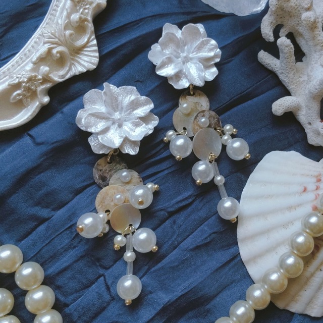 白い花とシェルとパールの耳飾り。 トップの花は立体的で絶妙な質感と光沢感が美しく目を引きます。下には鱗のように重なるシェルからパールが揺れます。 ナチュラルで上品、清廉で華やか。パールの美しさが花咲く耳飾りです。 ピアス、イヤリングともに貼り付けタイプ。 ピアスはスタッド、イヤリングはネジバネ式です。 長さ約5.5㎝