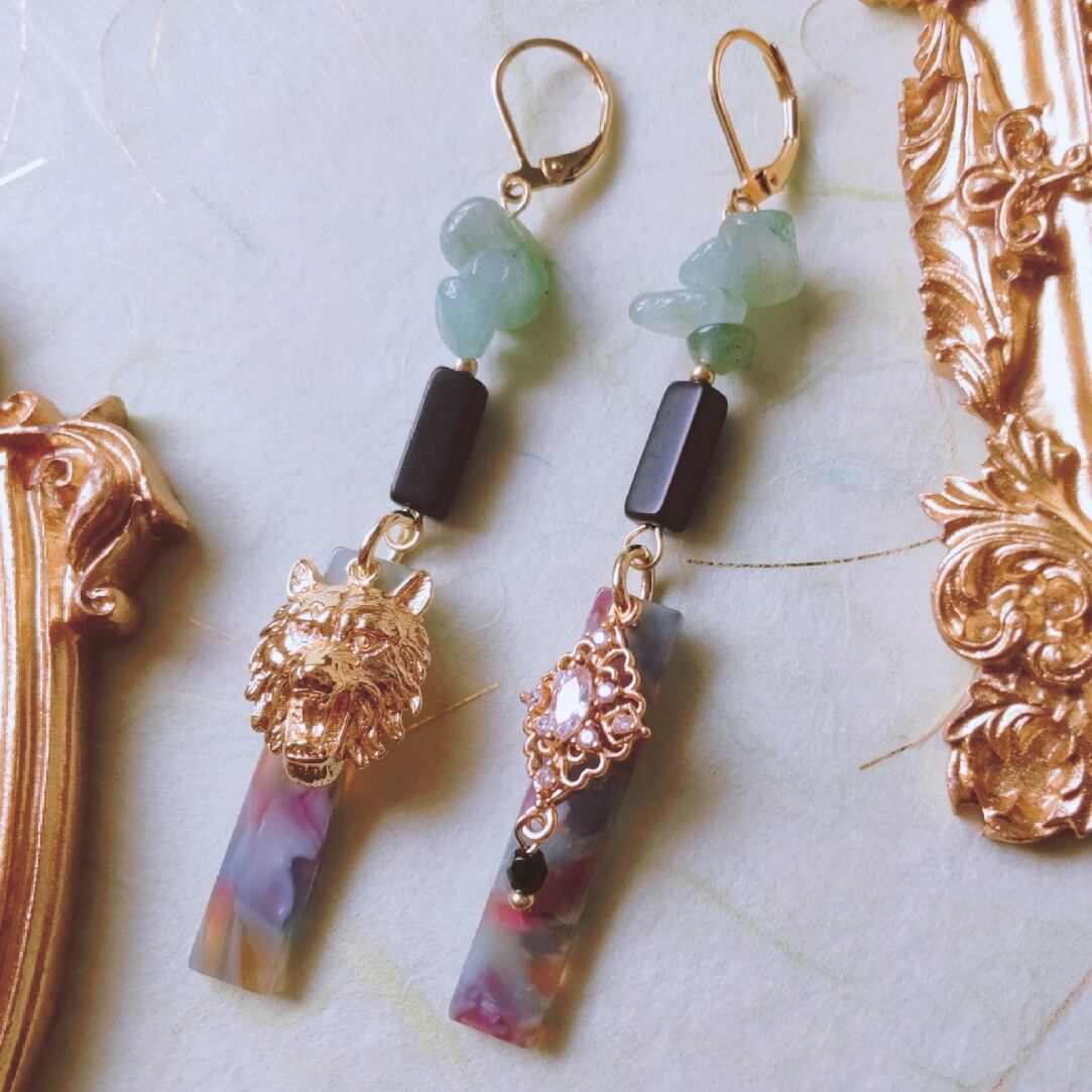 珍しい狼のチャーム、もう片側には狼の目のように鋭く輝くビジューが揺れます。ニュアンスカラーのプレートはほんのりと透け感もあり何色も混ざり合った色味が美しいです。トップの細石は翡翠。
