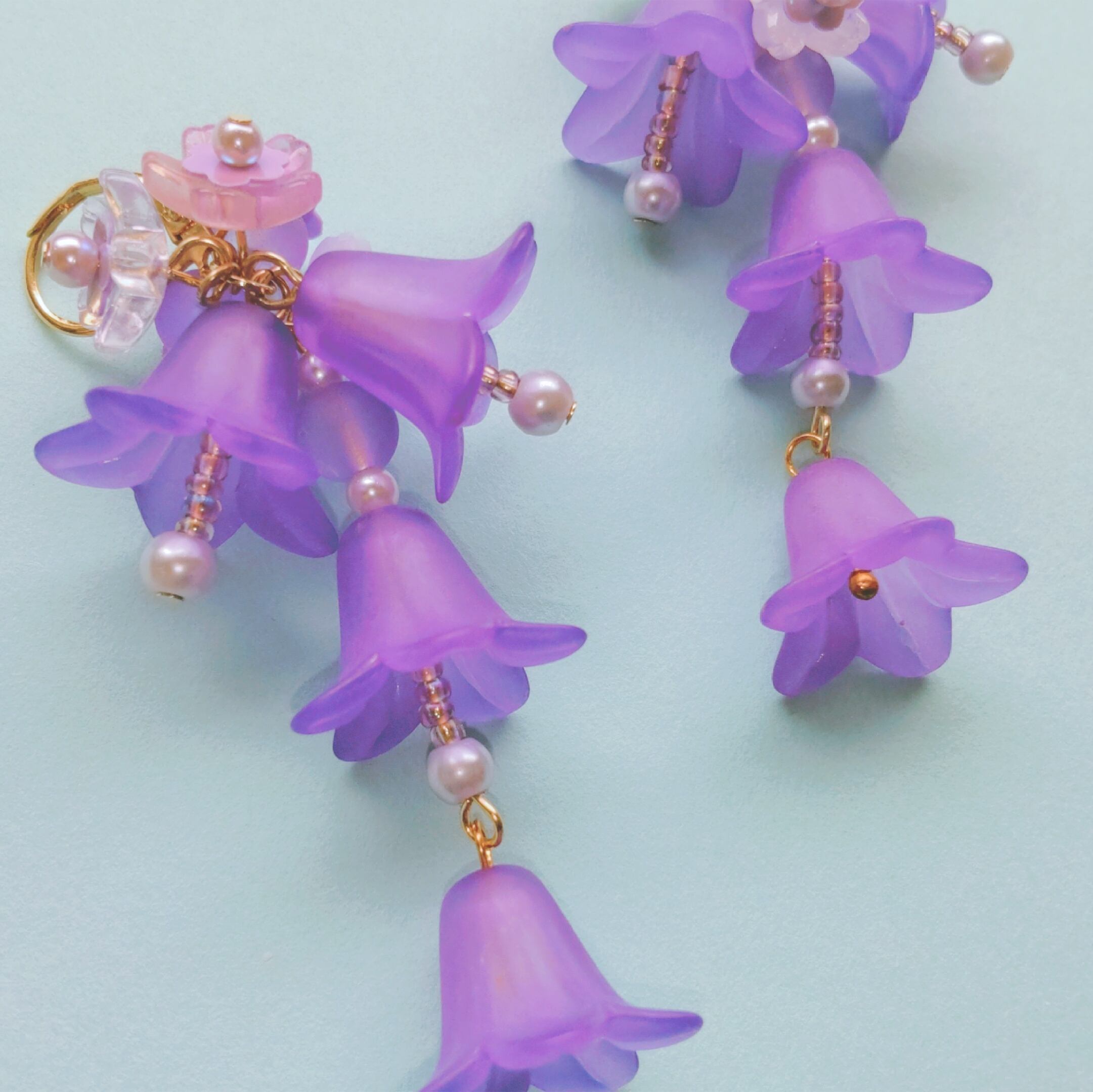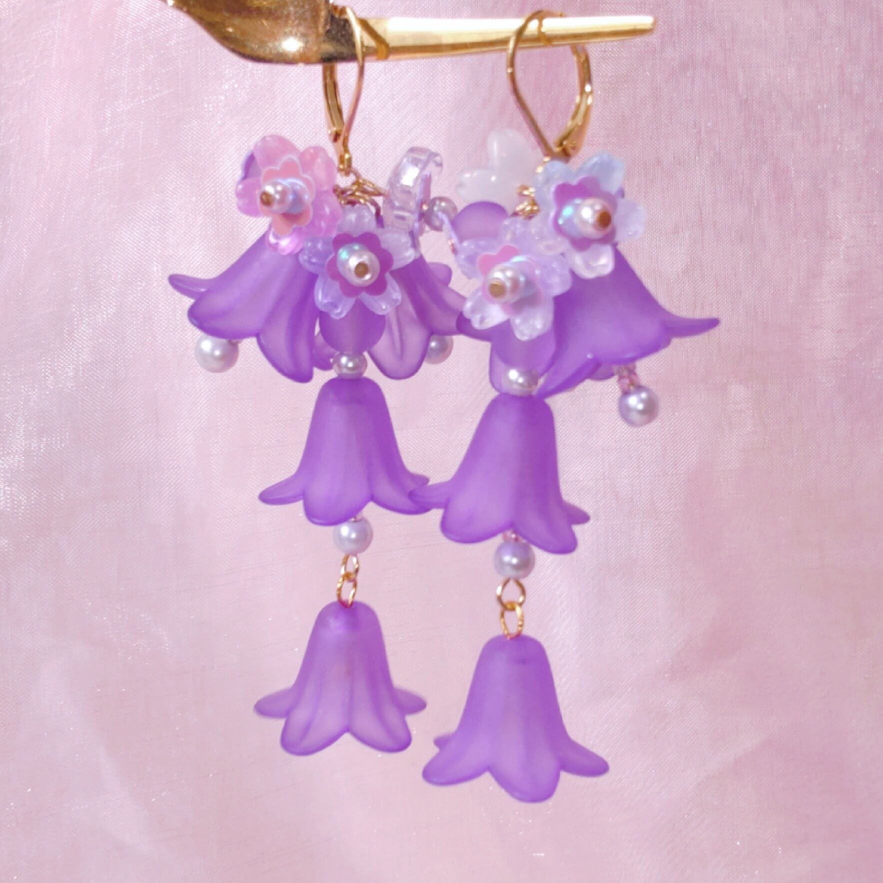 パープルが美しく花が滴り揺れる耳飾り。
