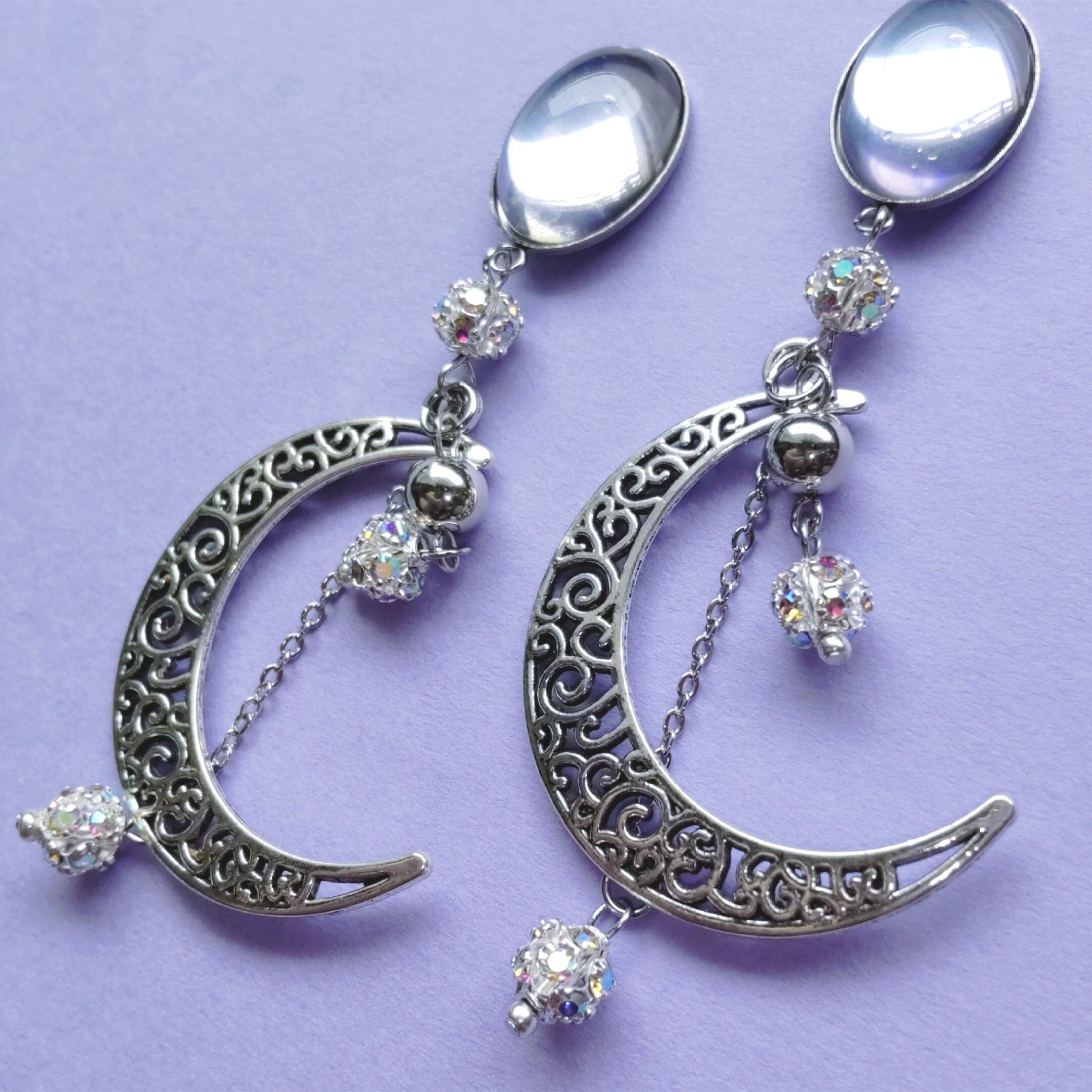 トップは水のようなちゅるりとしたクリアカラー。そこからオーロラビジューの埋め込まれたビーズやチェーンが揺れます。月はアラベスク模様の透かし彫りが綺麗です。