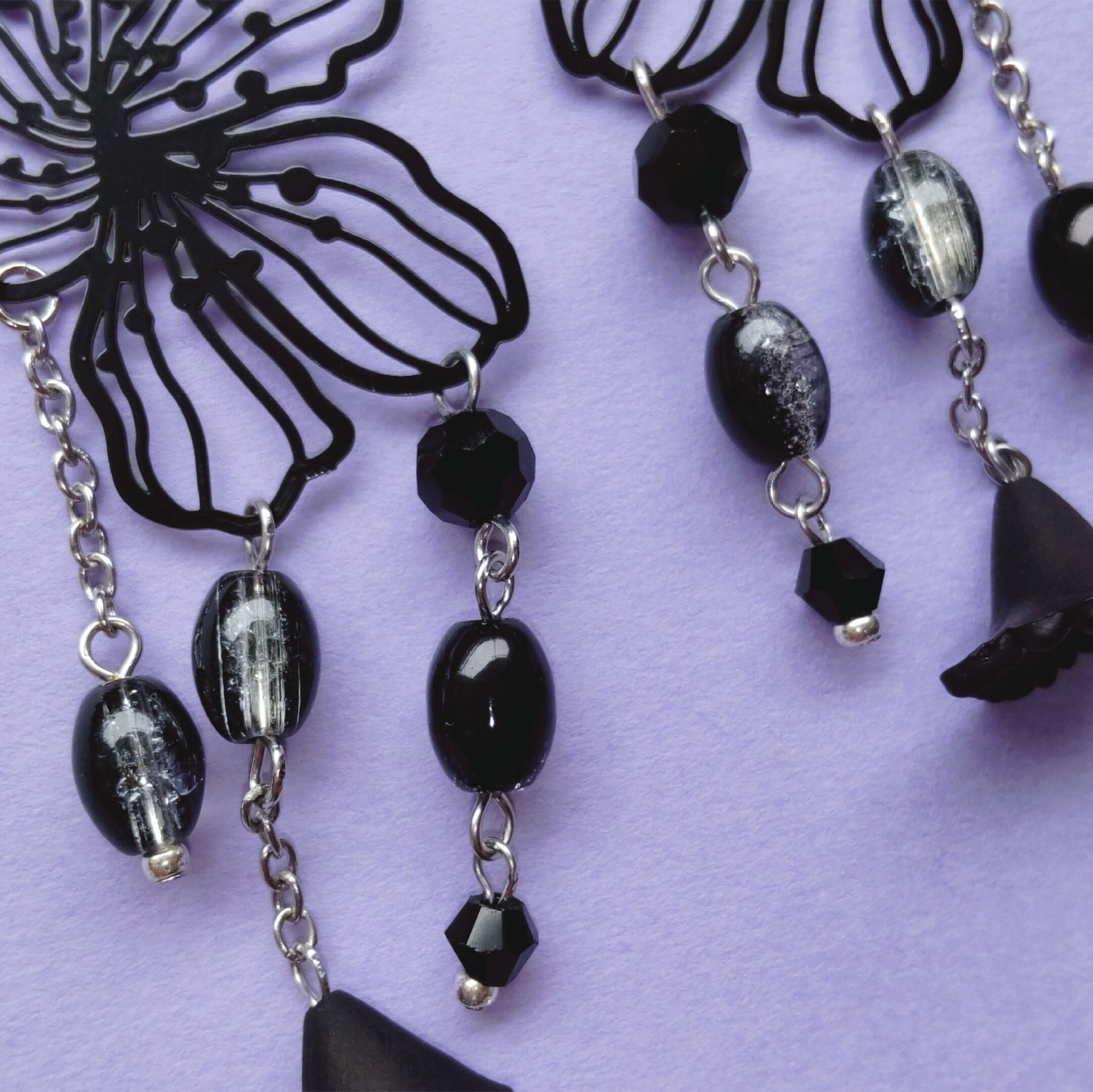 繊細かつ目を引くブラックの花のシルエットパーツに、ブラックのビーズと小花が揺れます。楕円形のビーズはブラックベースに氷が割れたようなクラック質感がとても綺麗です。