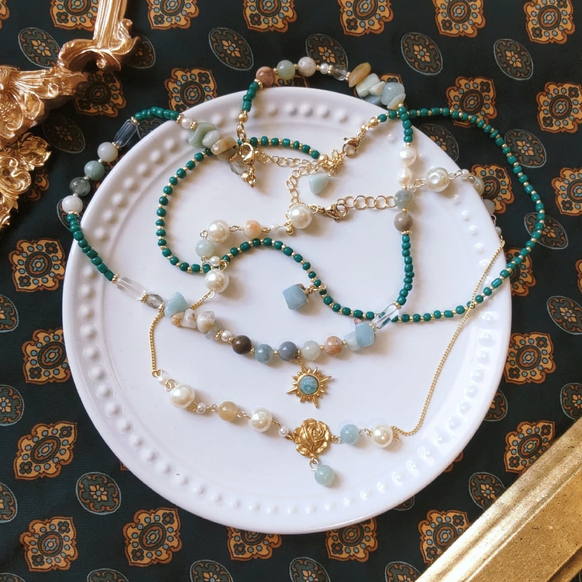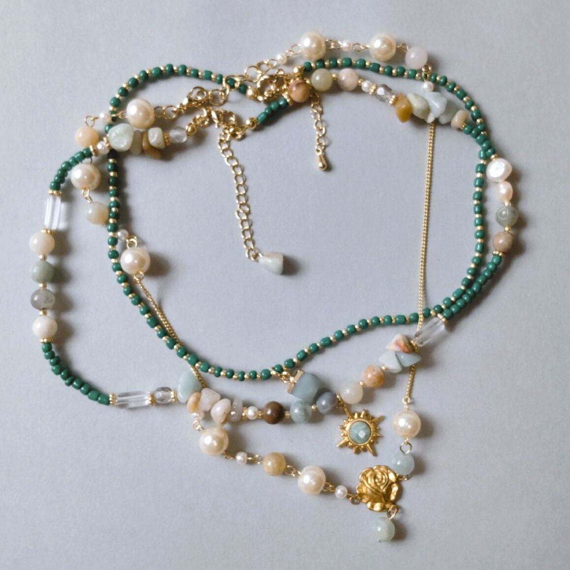 アマゾナイトは心を癒し良い気を与え、夢を叶える後押しをしてくれる石と言われているそうです。そんなアマゾナイトが3連それぞれのネックレスに全て使われています。
