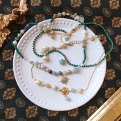 アマゾナイトの自然界の緑や水源を感じさせるような色味に深い緑のビーズやクリアビーズ、真鍮のゴールドが綺麗です。
