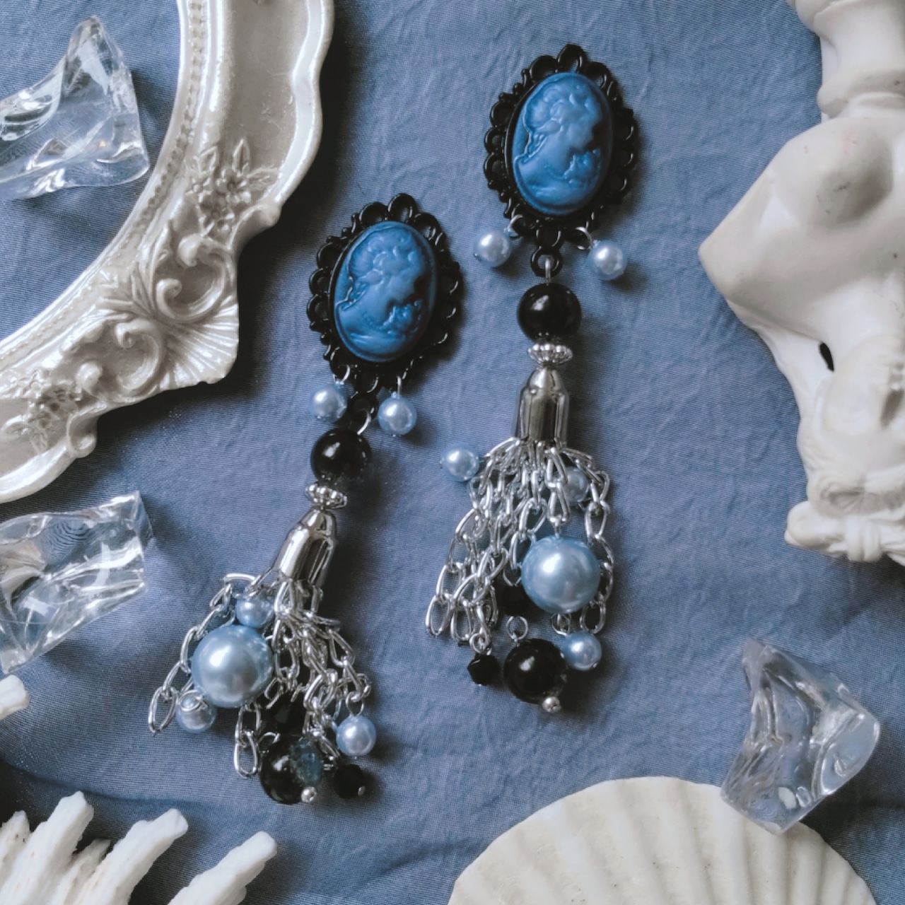 夜の海のような美しい黒と深い青のカメオカボションに、シルバーのチェーンタッセルがドレスのように揺れ広がります。サックスブルーのパールや黒のガラスビーズがドレスを彩ります。
