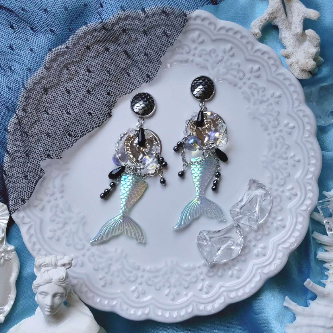 人魚のオーロラブルーのパーツが印象的で、トップには媚びなくてダークな美しさのあるメタリックブラックのカボション、全体に同色の小粒ビーズやオーロラビーズが散りばめられています。