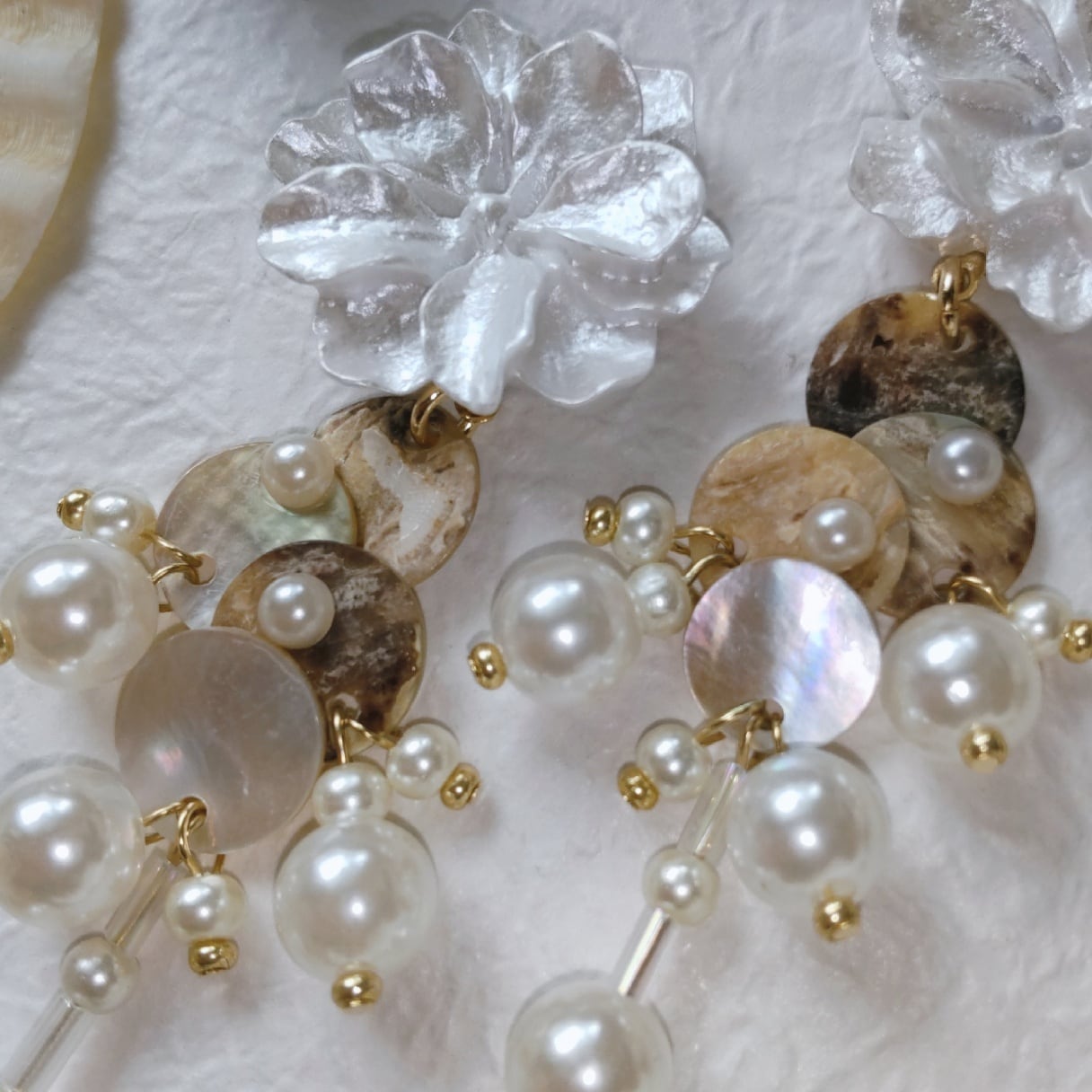 ナチュラルで上品、清廉で華やか。パールの美しさが花咲く耳飾りです。