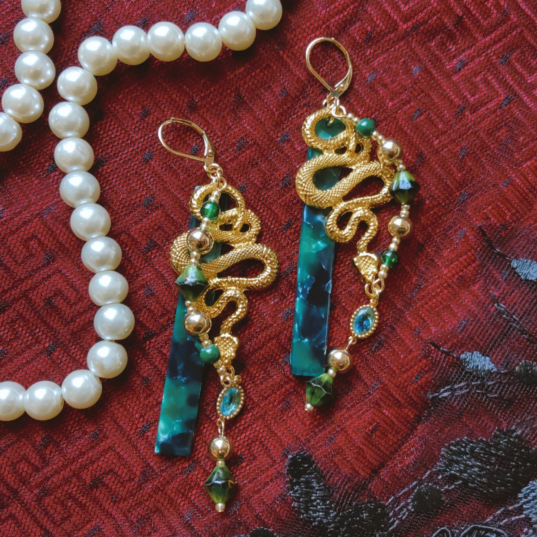 美しいゴールドの蛇に、魔力のありそうなグリーンのビーズやプレートとアクアブルーのビジューが輝きます。蛇の裏のプレートは深いグリーンとブラックがマーブルになっています。