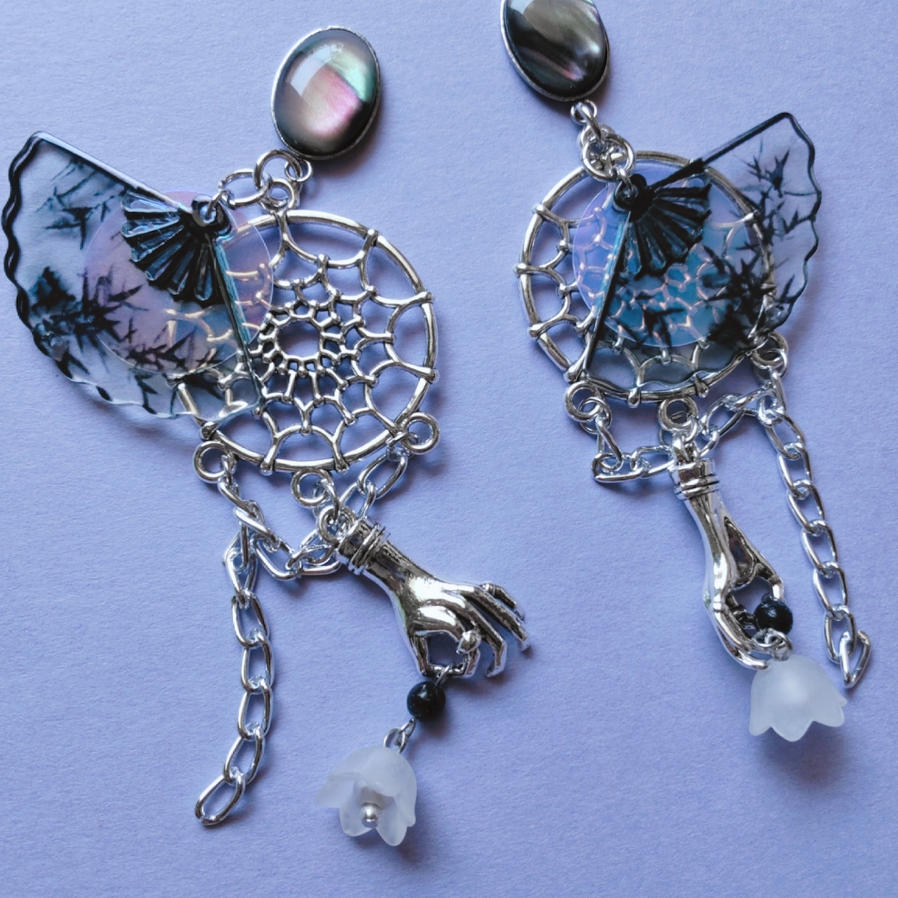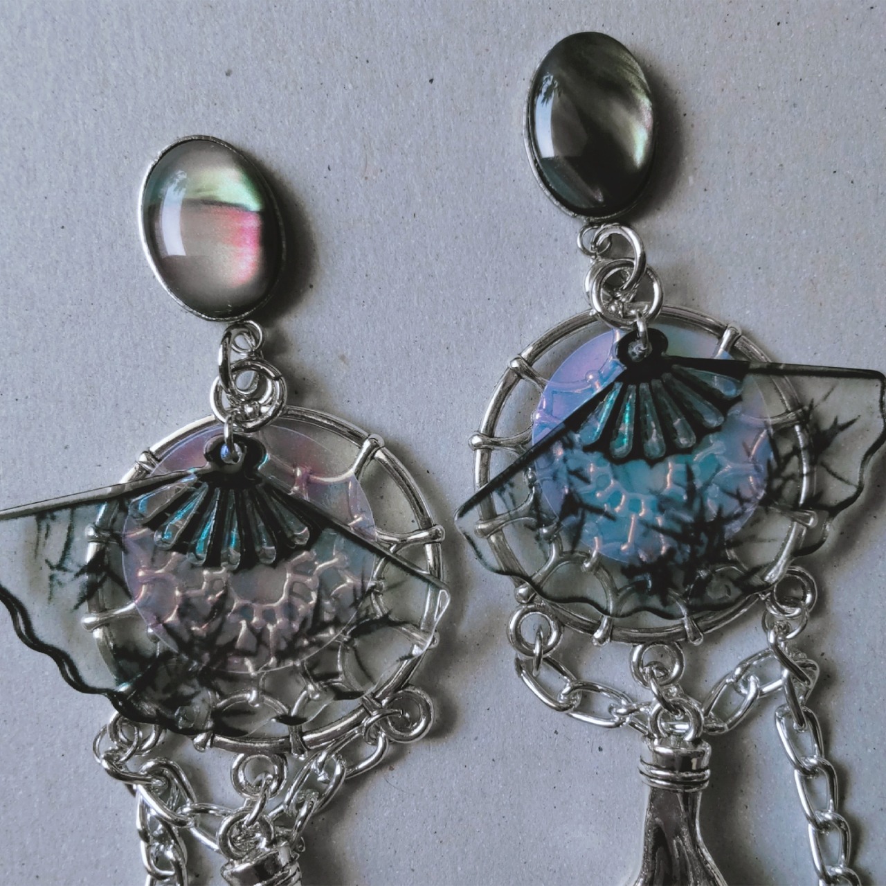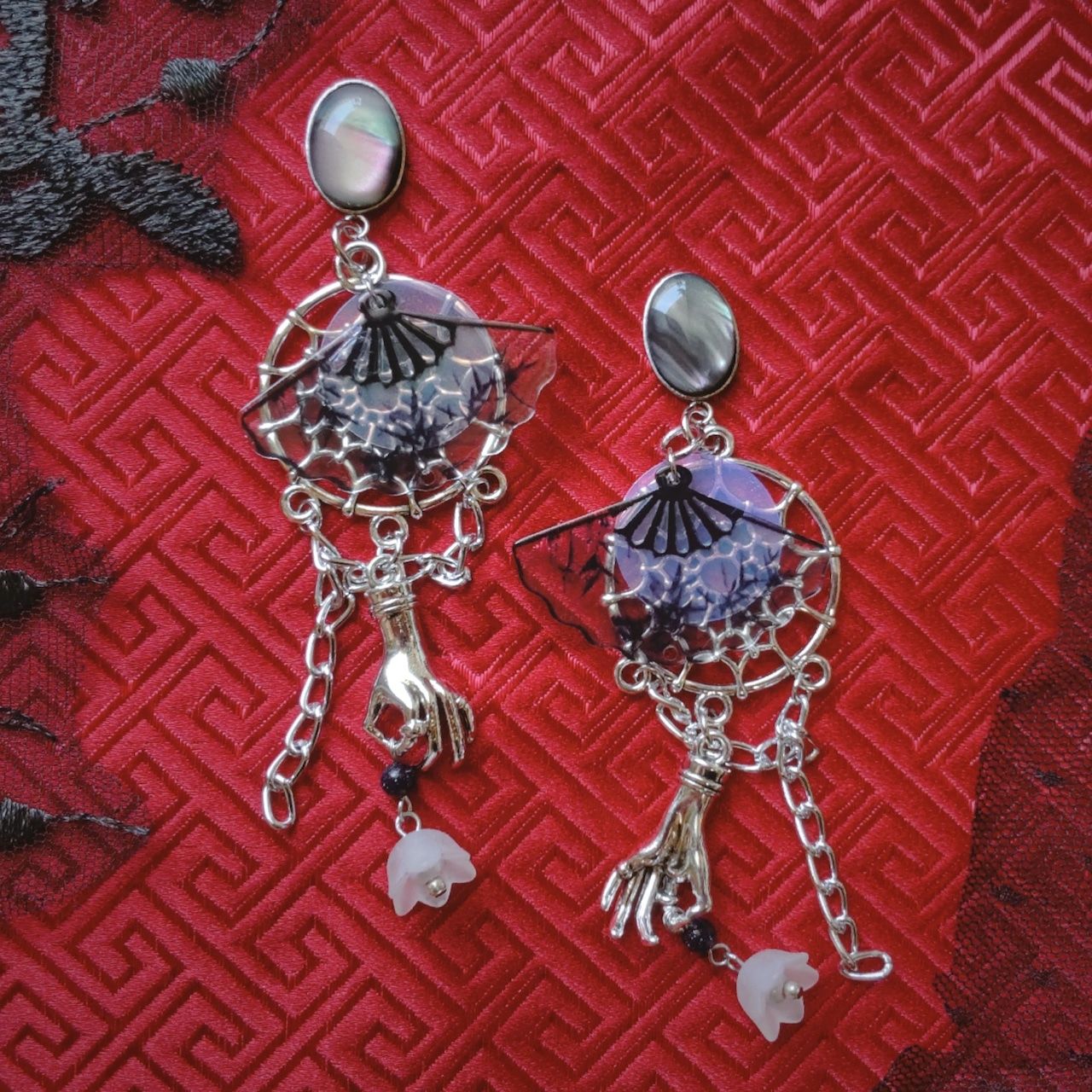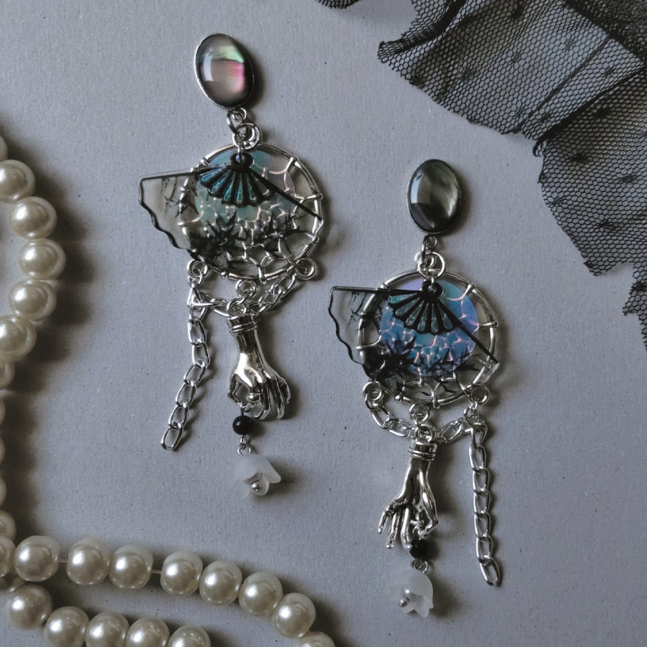 蜘蛛の巣と垂れ下がる糸のようなチェーン、あでやかな扇子に繊細な指先と花が麗しく、媚びない強さもあります。オーロラ偏光の円状パーツや、螺鈿のようなブラックベースにグリーンやピンクの光を放つカボションも艷やかで綺麗。