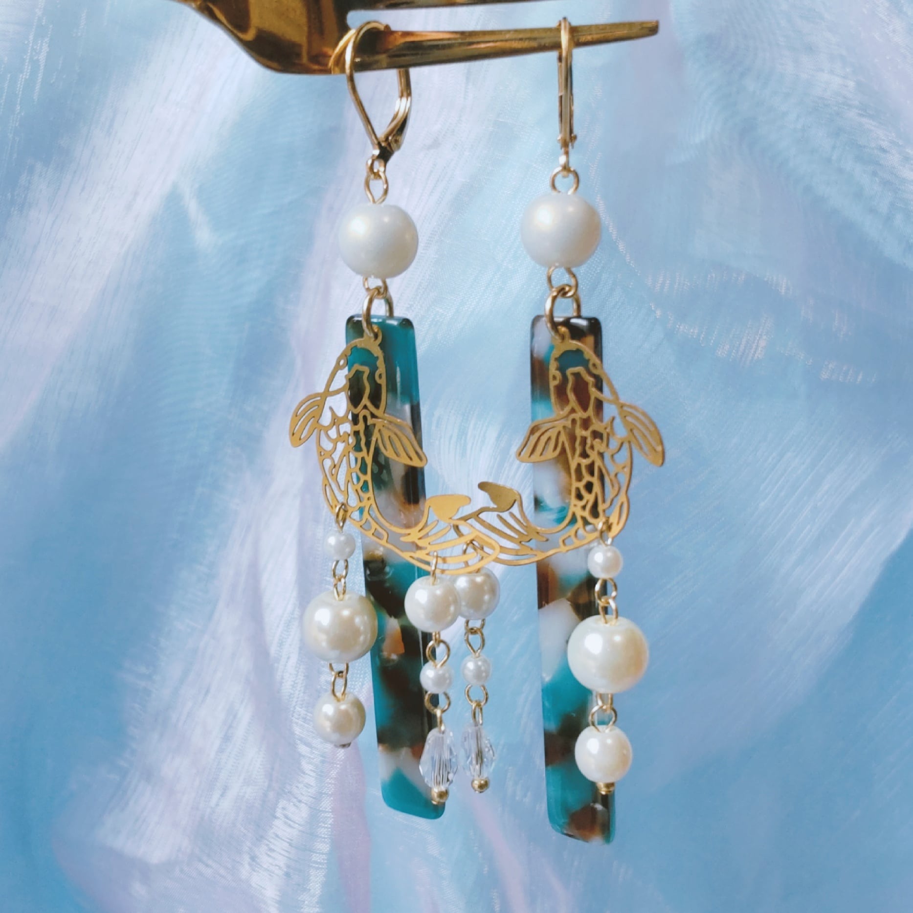 縁起の良い話もある鯉の透かし彫りに泡のような大小のパール、エメラルドブルーとブラウンのマーブルが綺麗なプレートが上品で印象的。