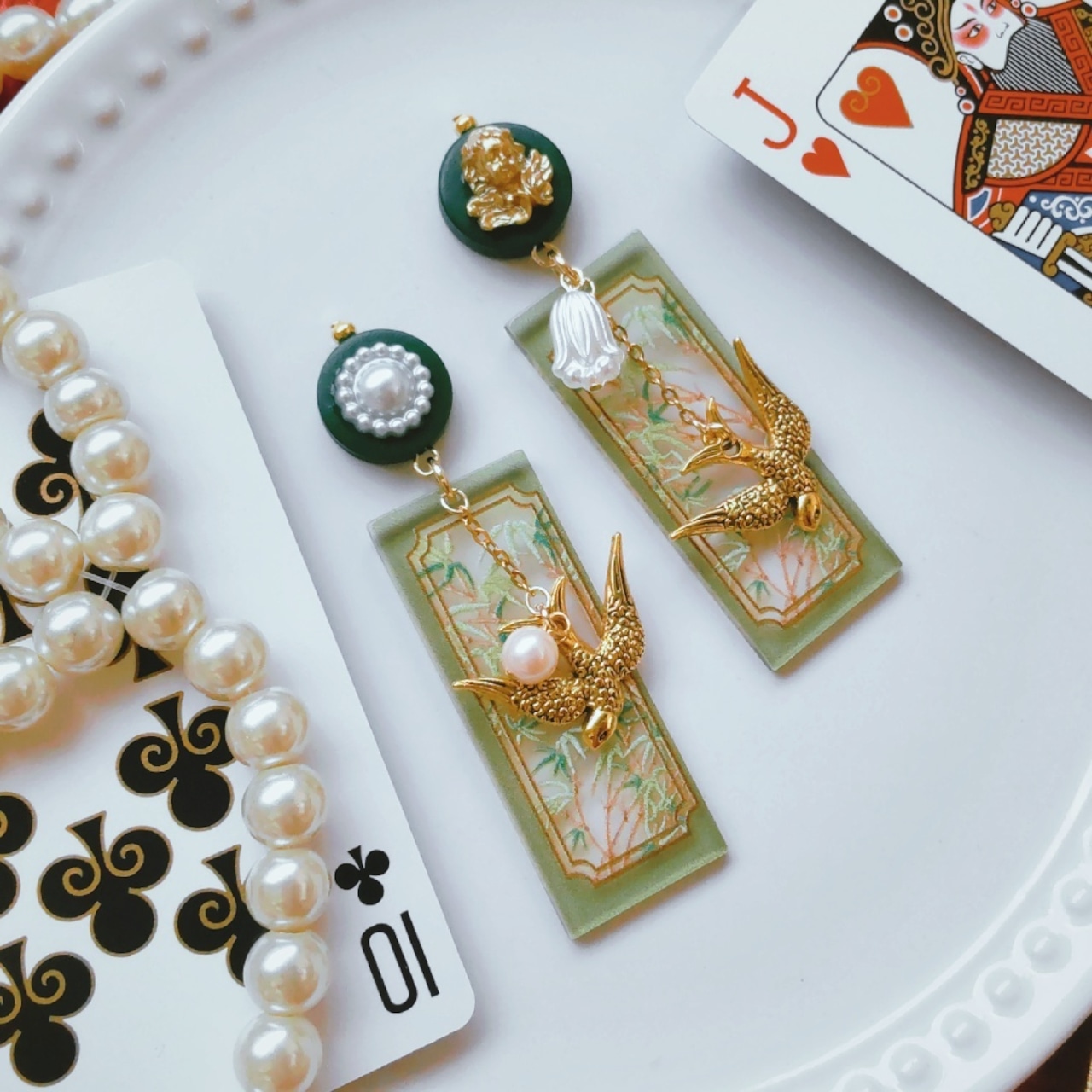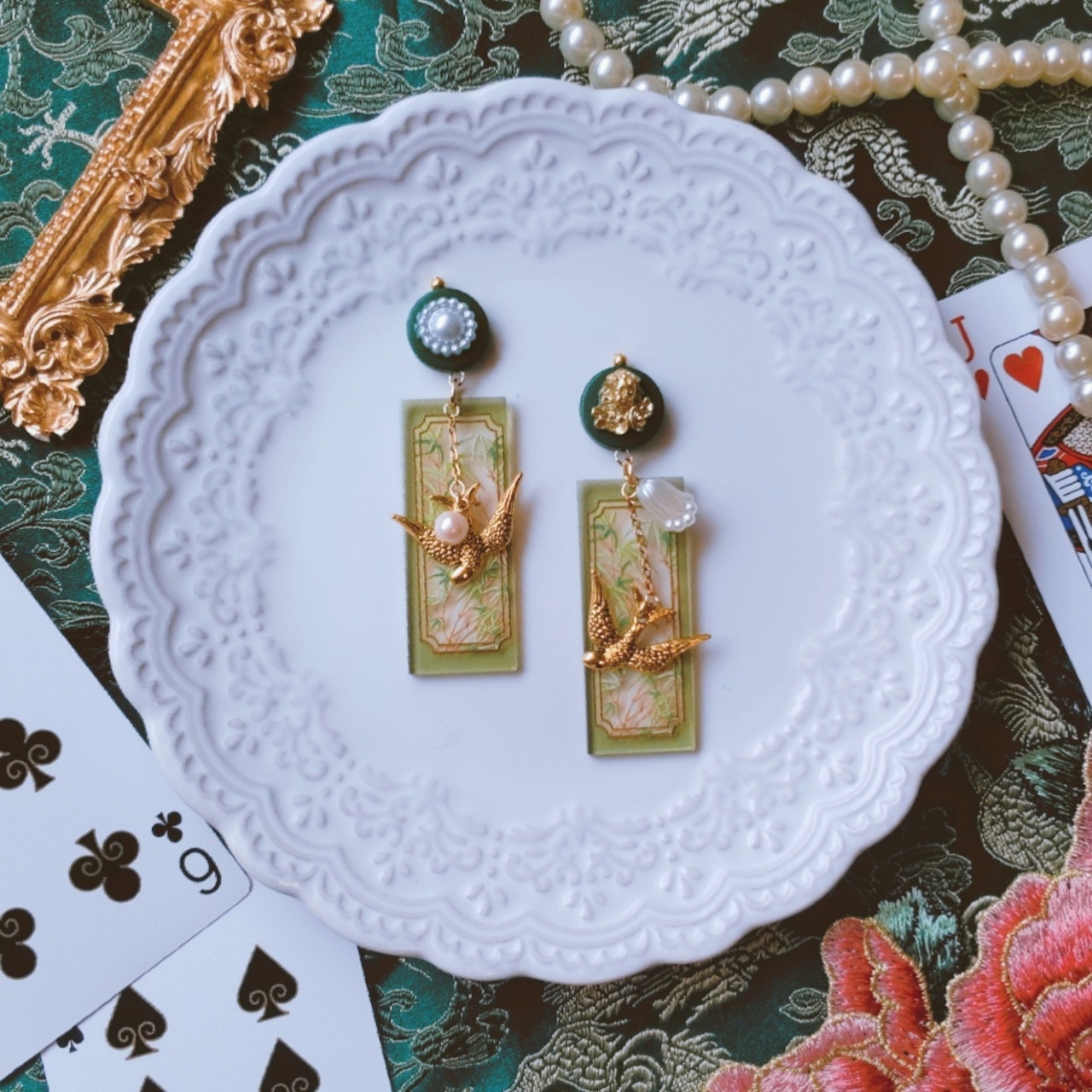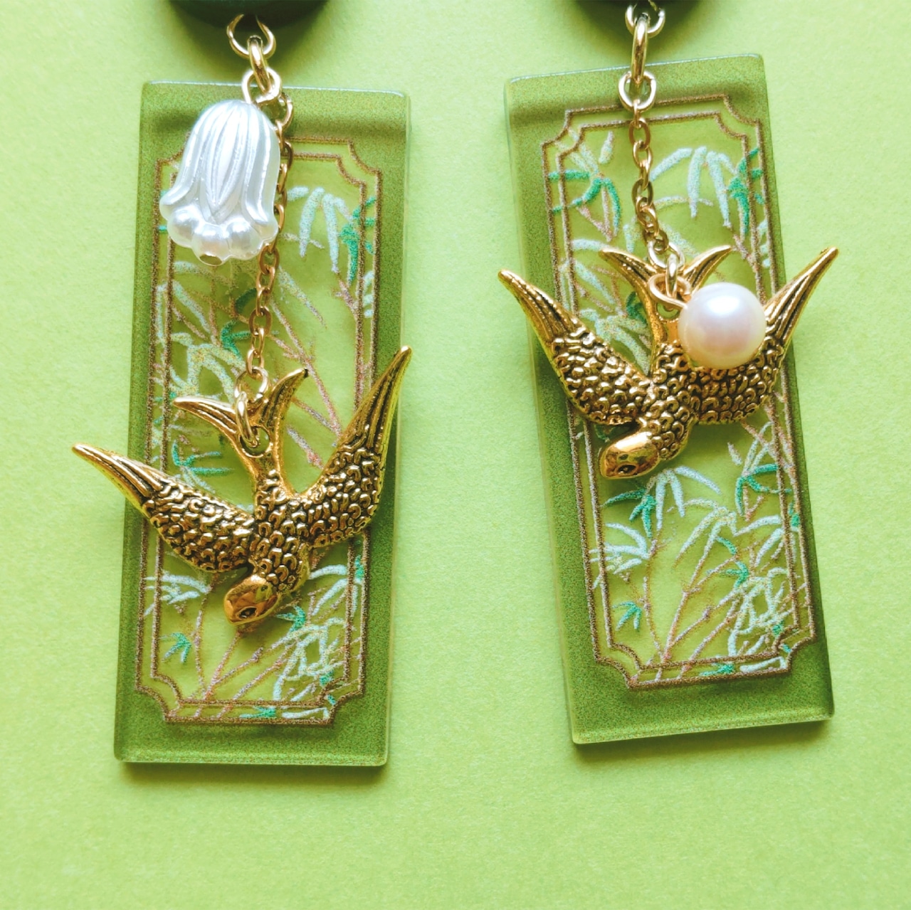 澄んだ黄緑が美しい清涼な竹林のプレートに、シックな小鳥のチャームが揺れます。オレンジみのあるパールはヴィンテージ。