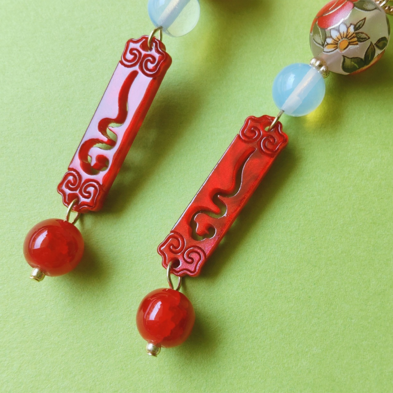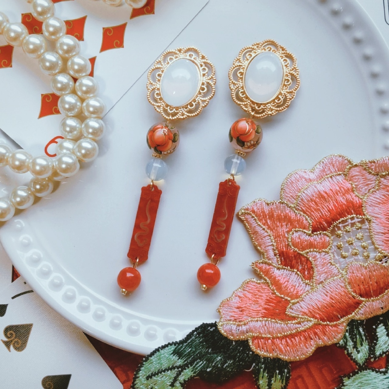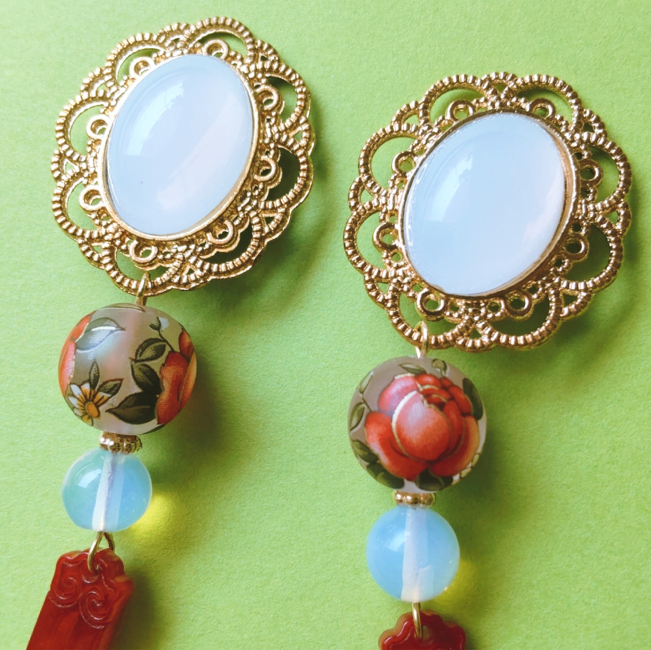 美しいカボションの下にはチャイナドレスを思わせる繊細な花柄のビーズと透かしや質感の綺麗なプレートが揺れます。