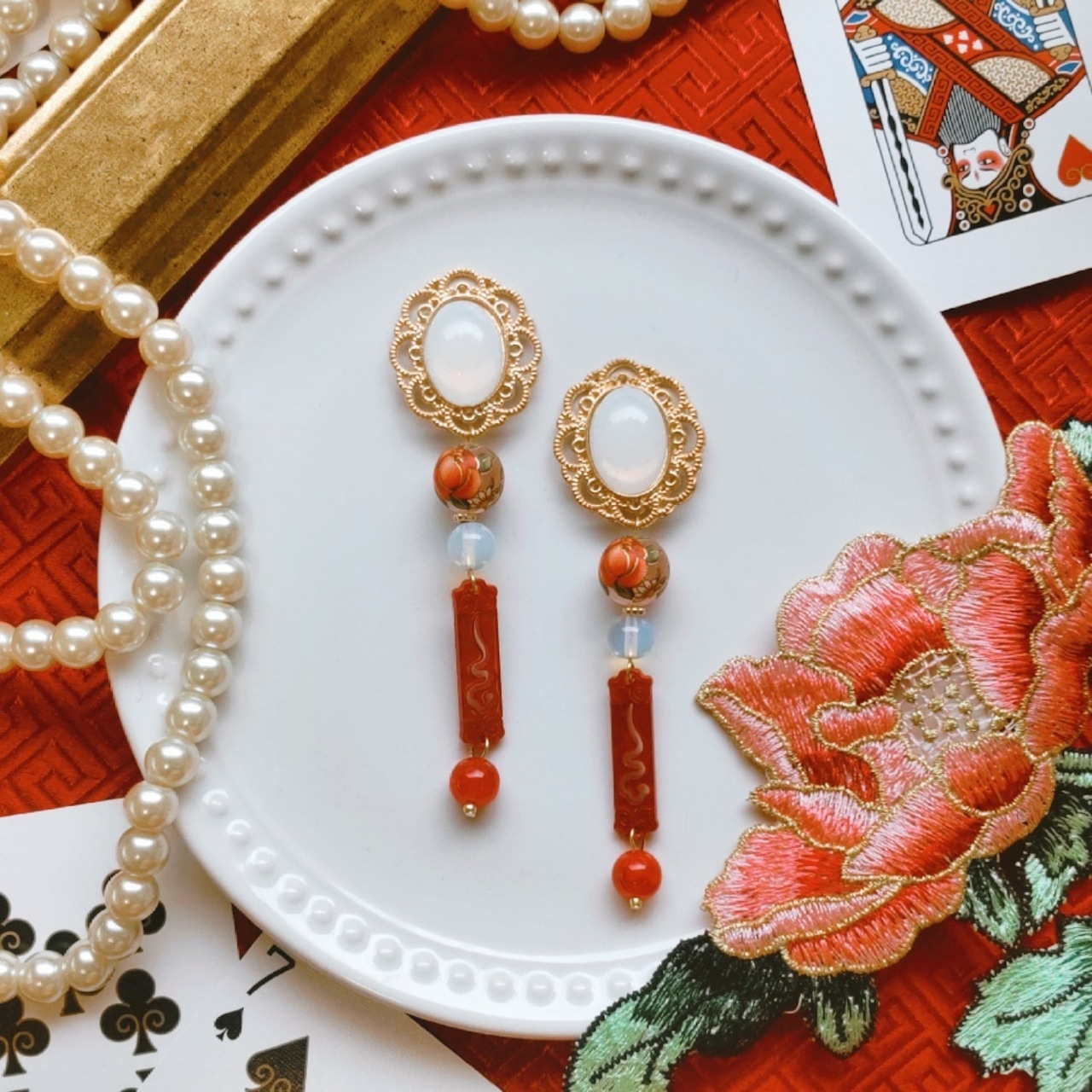 華やかな赤とオパールのような蕩ける乳白色の耳飾り。