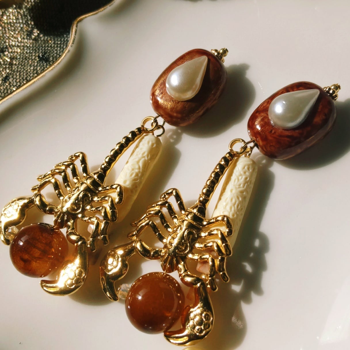 ミステリアスで存在感のある蠍に、ヴィンテージのトップパーツとべっ甲ビーズがシックで綺麗です。