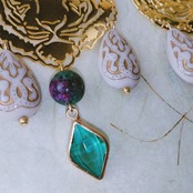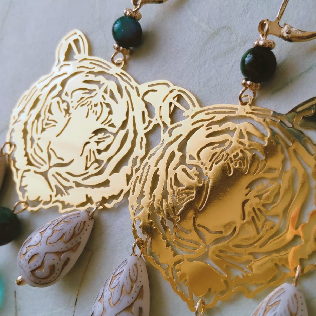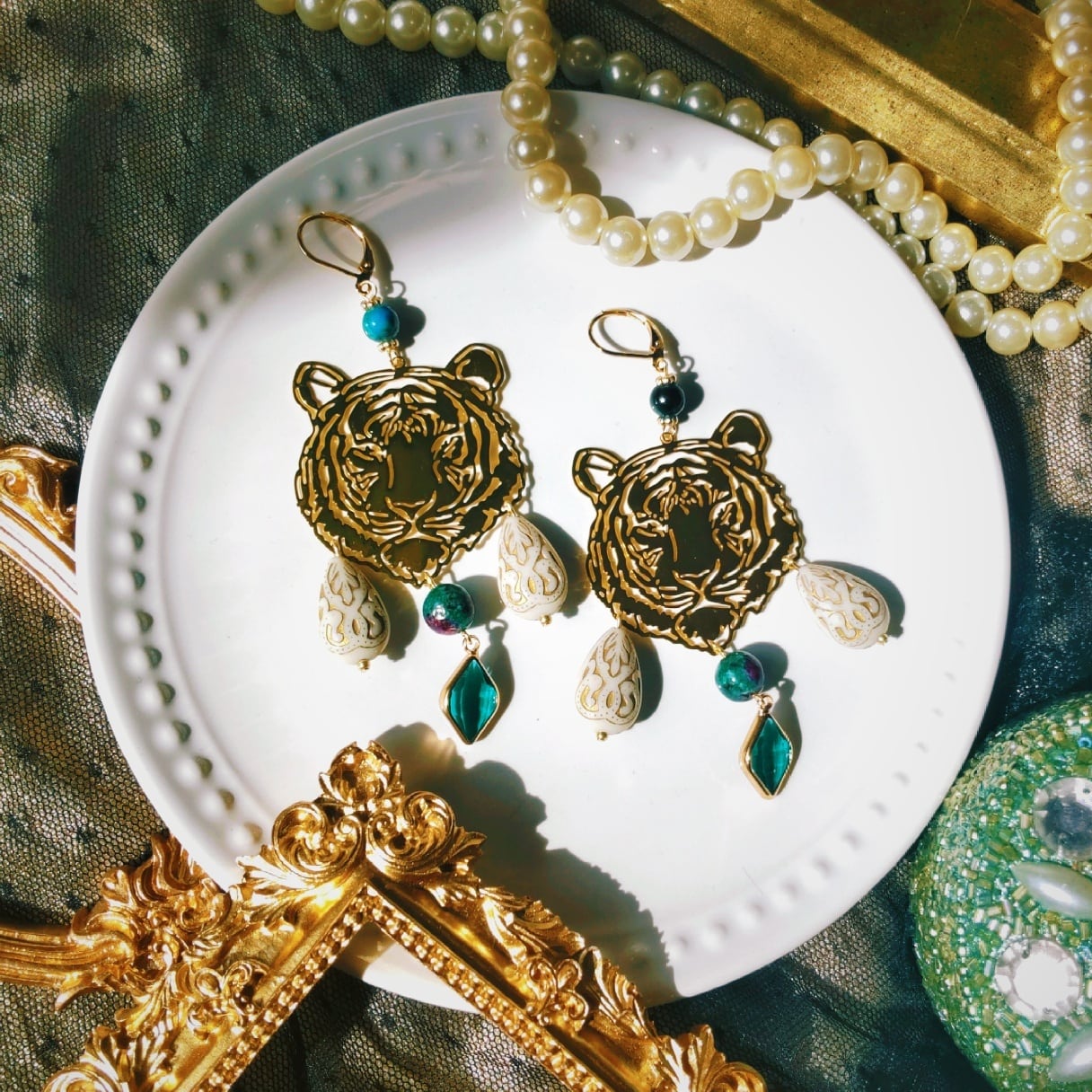 繊細で大きな(約cm✕cm)の虎の透かし彫りチャームに、エキゾチックなドロップパーツ、ゾイサイトの石、ディープグリーンのビジューが揺れます。