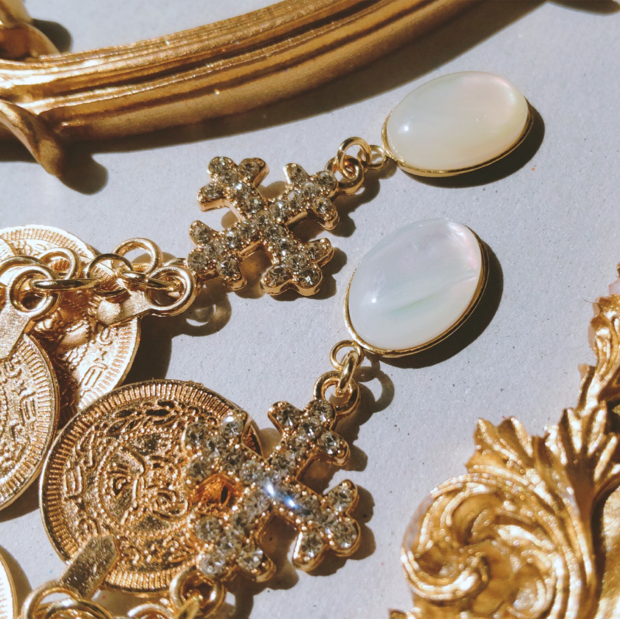 魔法のようなオーロラ変更のカボションに、煌めくビジューの十字、しゃらりと揺れるコインチャームたちがまるで財宝の山のよう。
