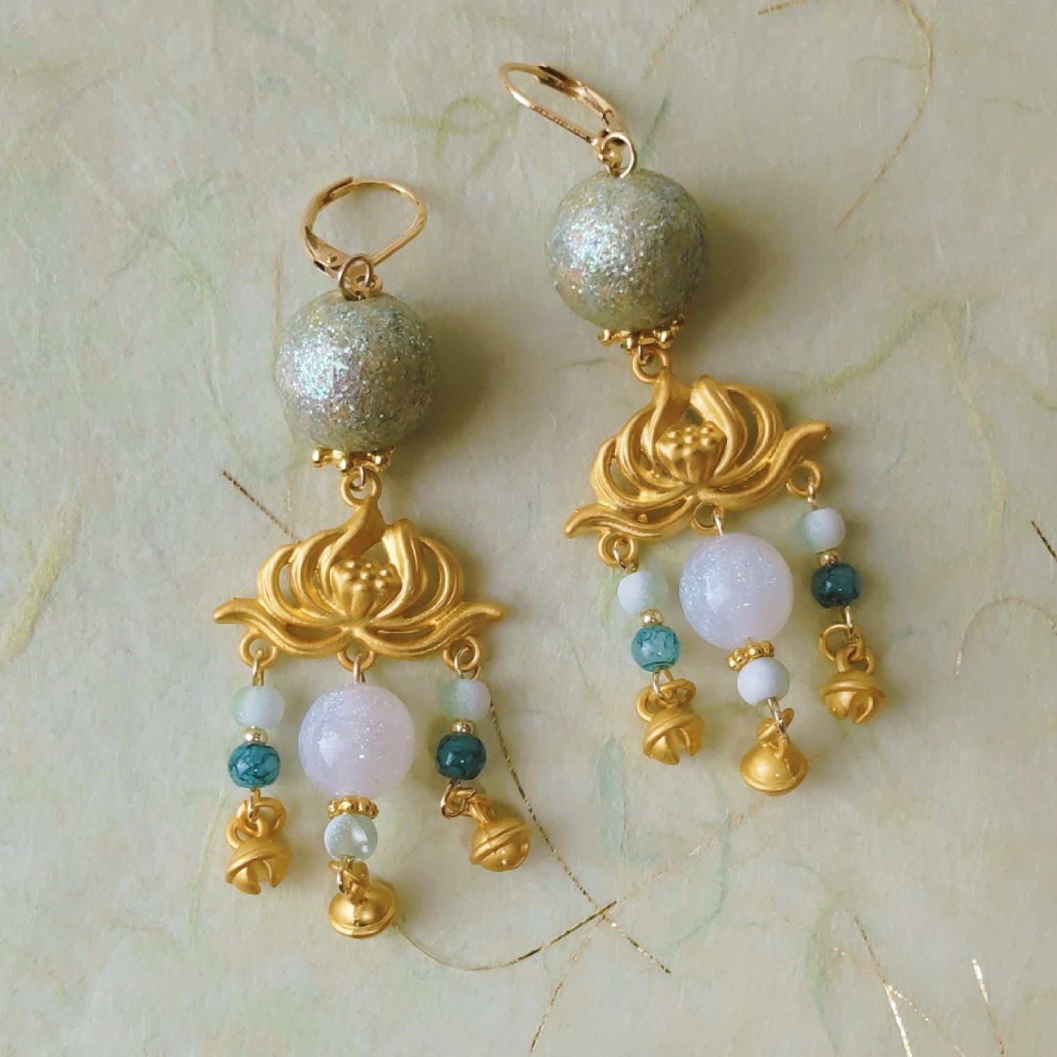 ライトグリーンベースにピンクやパープル、オーロラカラーのグリッターが煌めく魔法のようなパーツに、マットゴールドの上品なデザインの蓮、煌めきが閉じ込められたラウンドビーズ、同じくマットゴールドの鈴型のチャームが揺れます。
