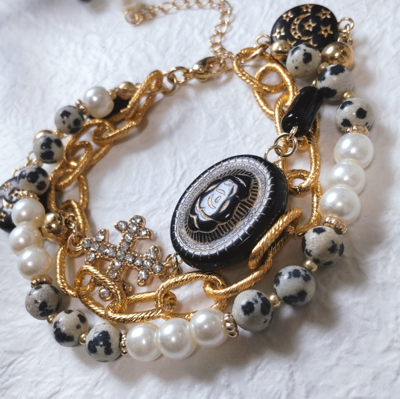 ブロンズ系ゴールドの大きめチェーン、クラシカルなブラックビーズ、パールとダルメシアンジャスパーのブレスレットが3連風に連なっていて華やかです。モノトーンですがゴールドとダルメシアンジャスパーの色味で温かみもあります。