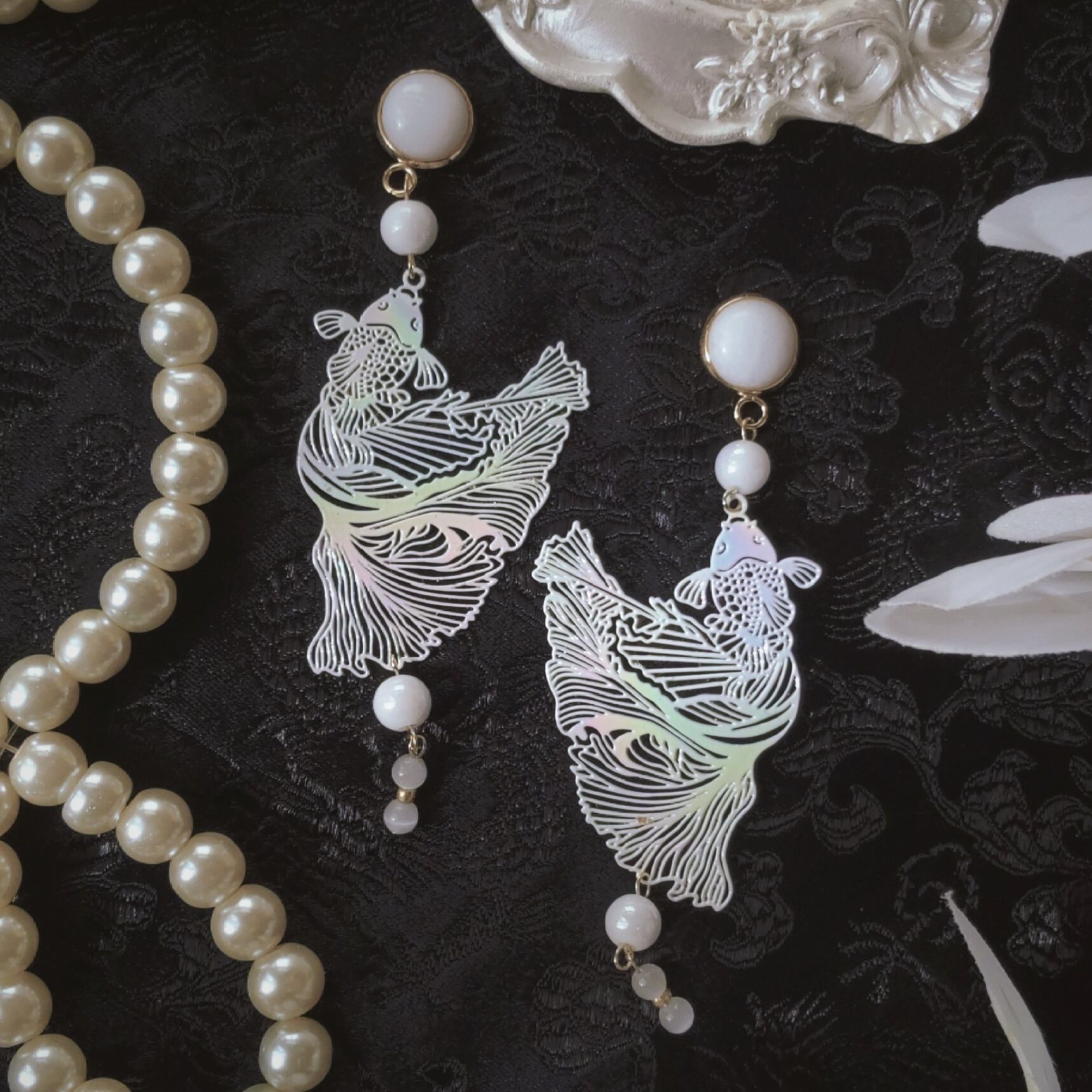 優雅で美しい熱帯魚のベタのパーツは遠目で見れば白、よく見るとオーロラカラーが夢のようです。下の泡のような小粒はキャッツアイ。