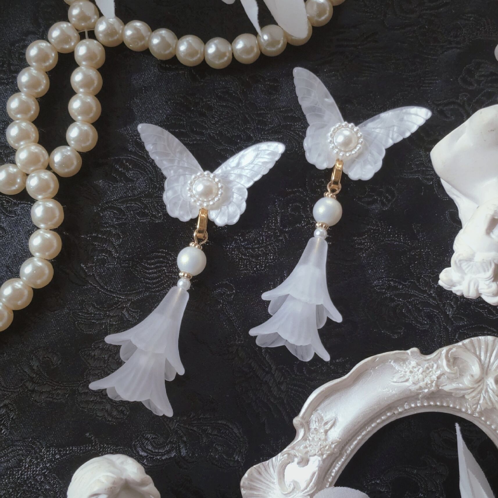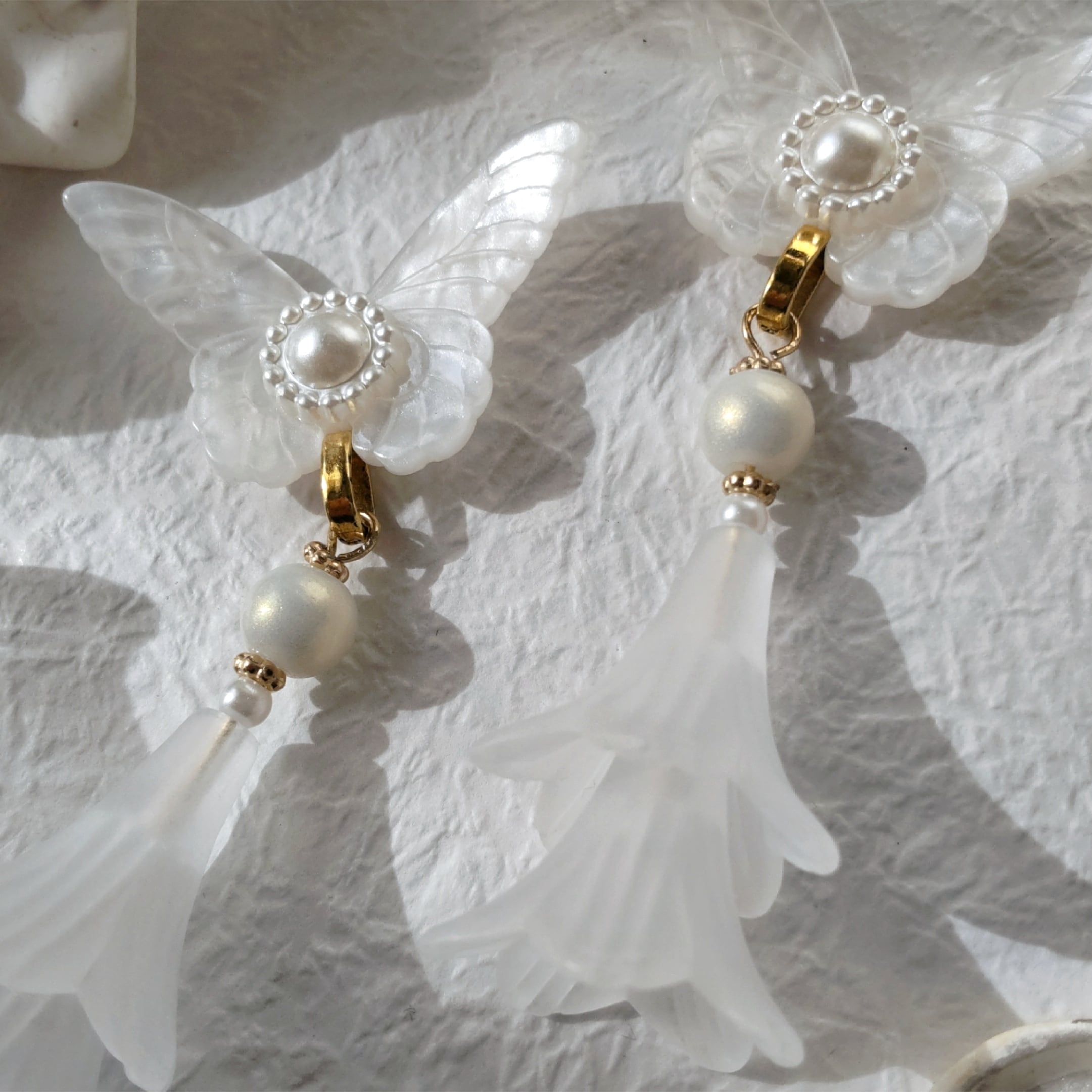蝶と花のホワイトワントーンな耳飾り。
