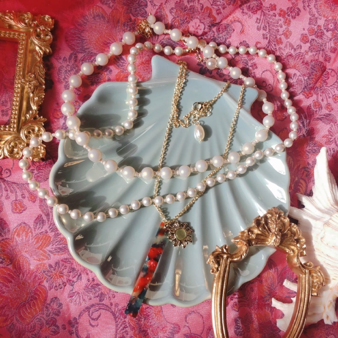 パールネックレスは大きさ長さ違いで2種、どちらもパウダリーな光沢が繊細で美しく、この季節の陽の光のよう。