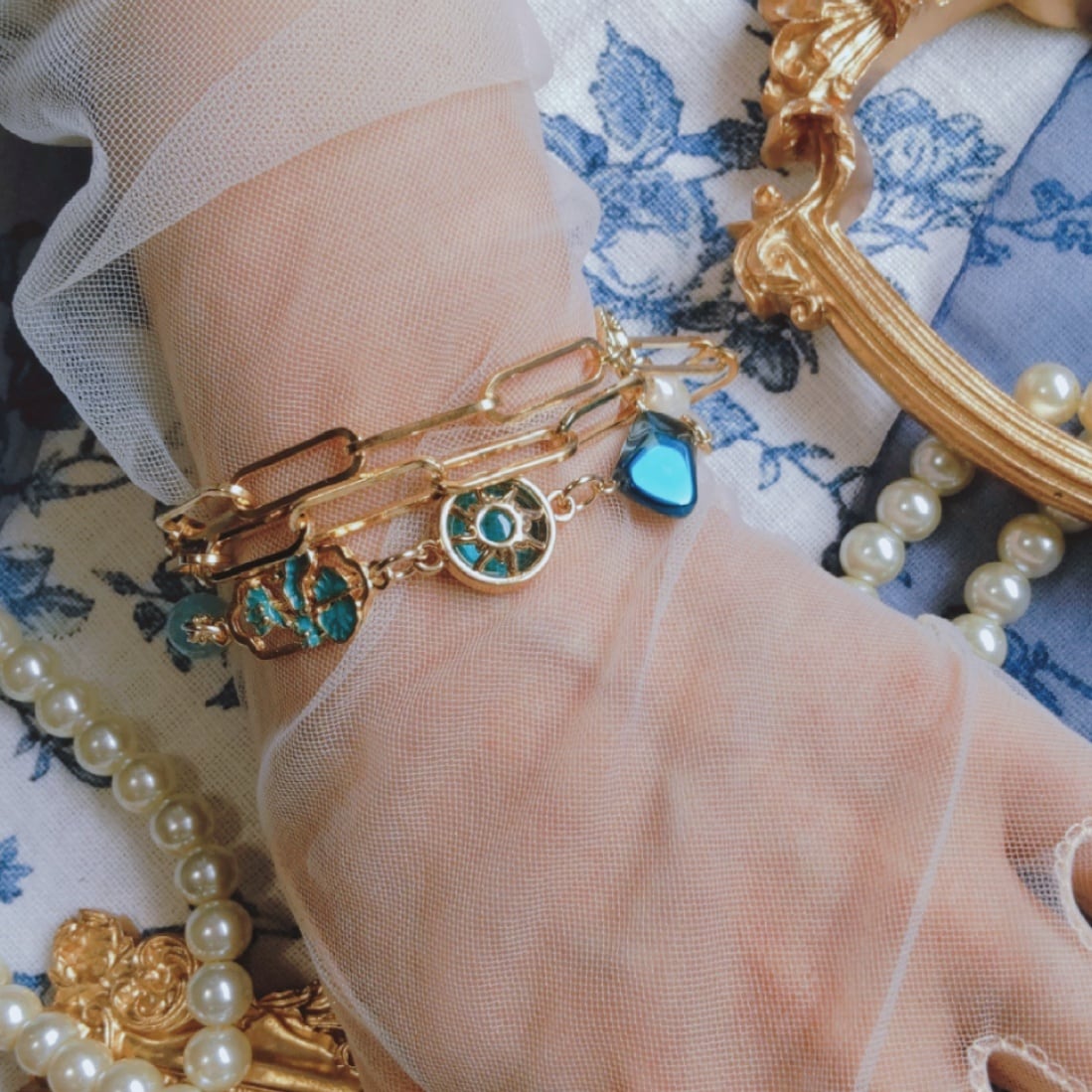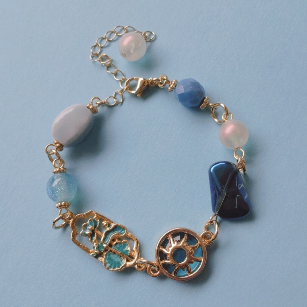 龍宮城の小さな宝石を繋げたようなブルー基調のブレスレットと、チェーンを巻き付けるタイプのブレスレットがセットになっています。