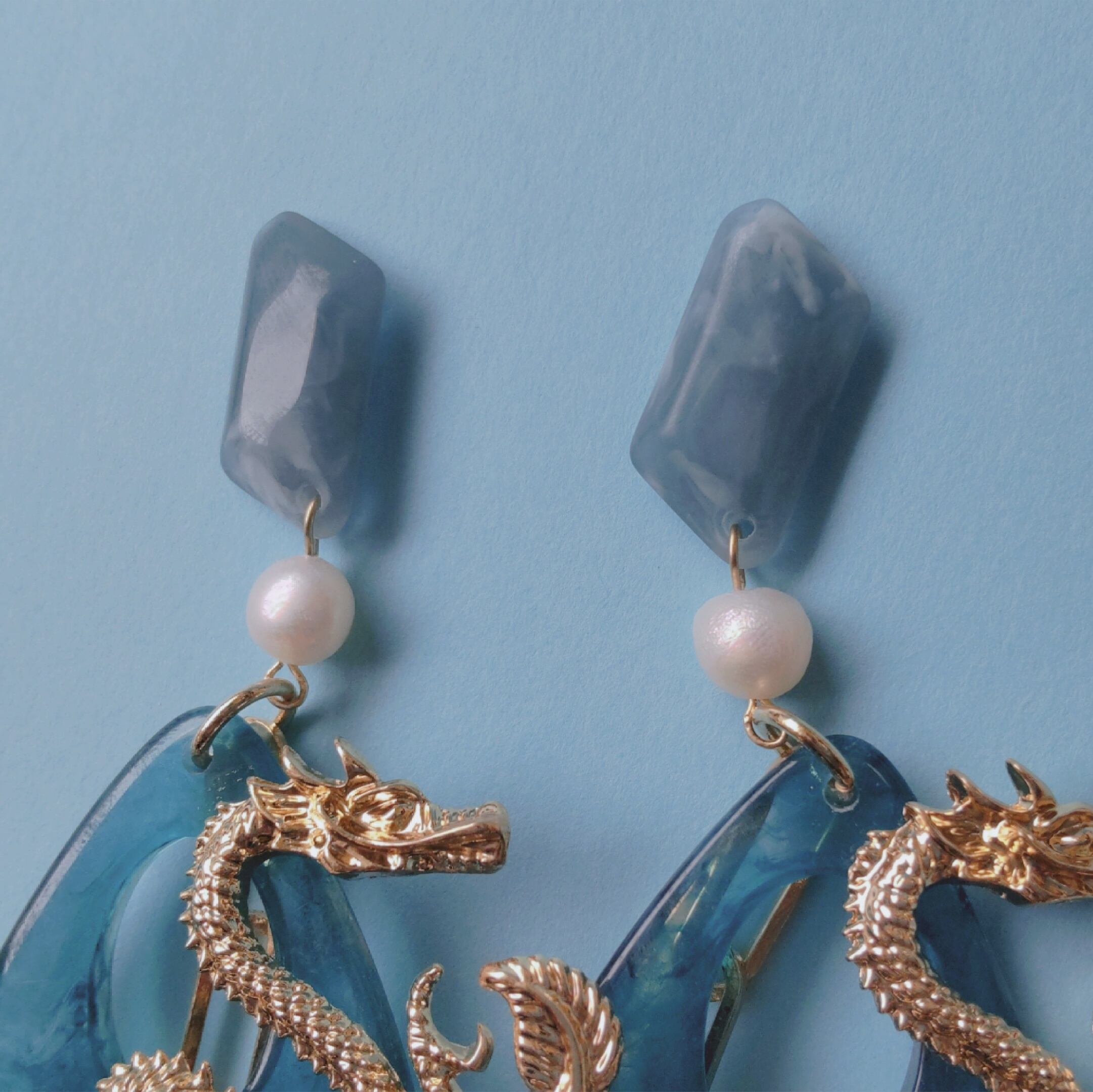海の色のアクリルマーブルパーツに龍が泳ぐように揺れます。上のパールは淡水バロックパール。トップは空のようなくすみがかったサックスブルーとホワイトのマーブルです。