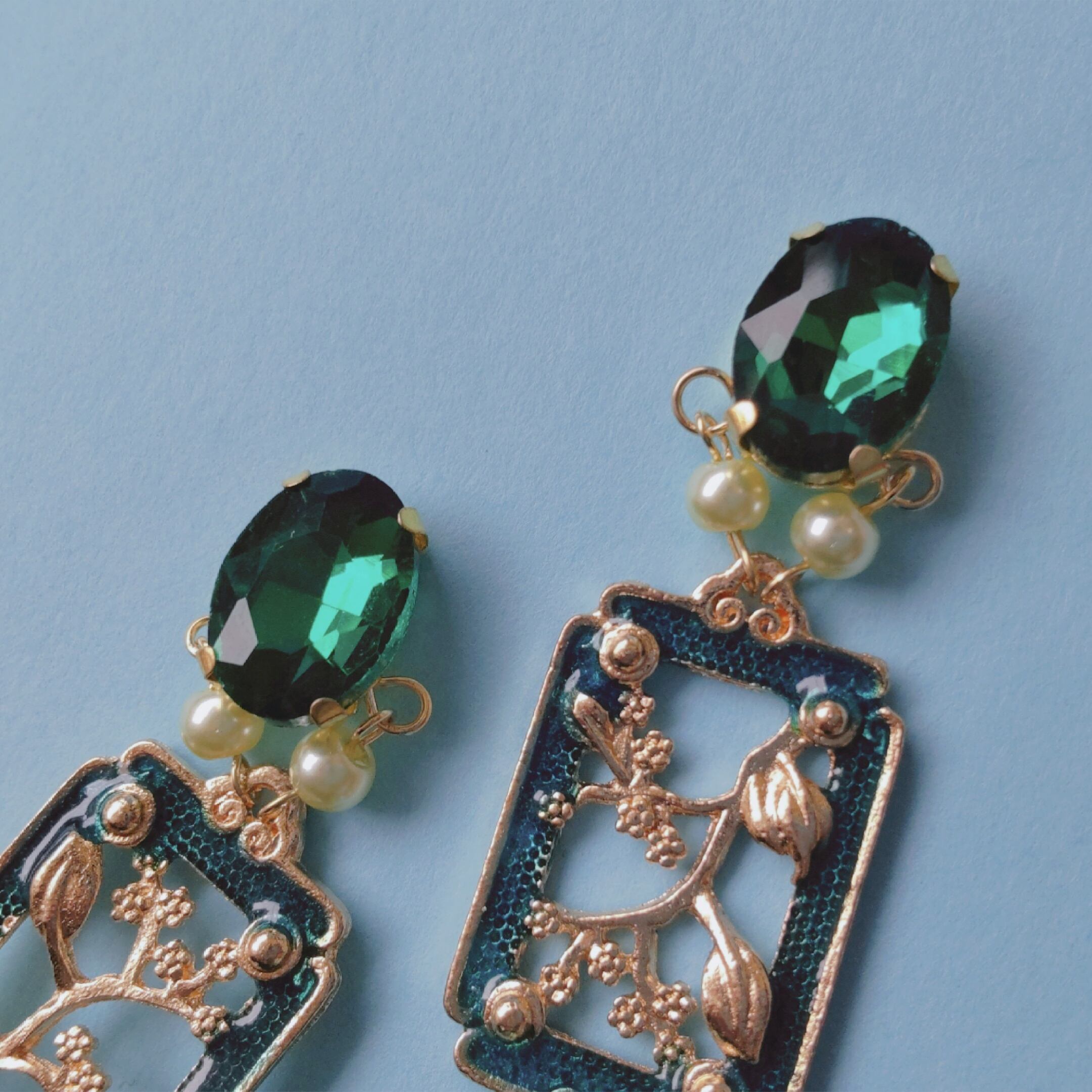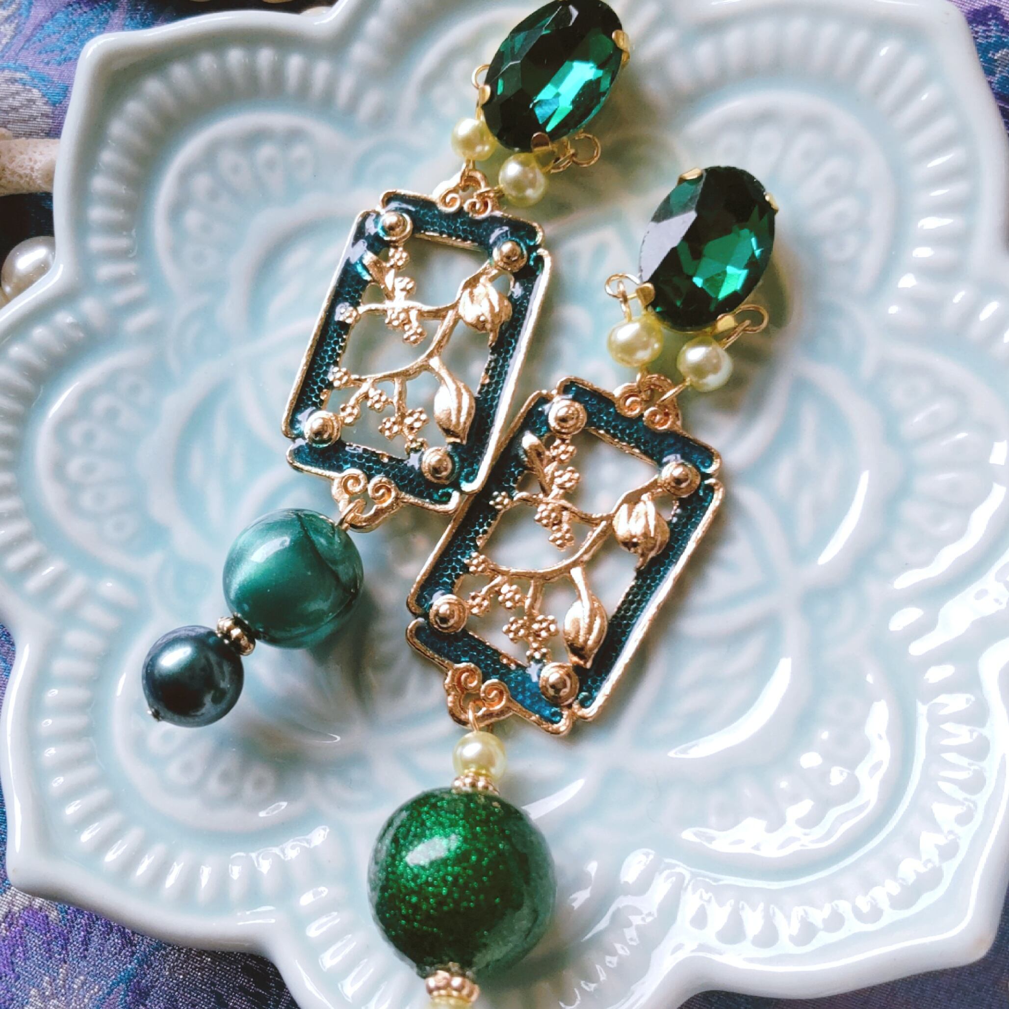宝石のように輝くエメラルドグリーンのビジューに、龍宮城の装飾のようなスクエアパーツ、左右アシンメトリーのラウンドパーツが華やか。煌めきを閉じ込めたようなラメボール、シルキーな光沢のビーズはヴィンテージです。