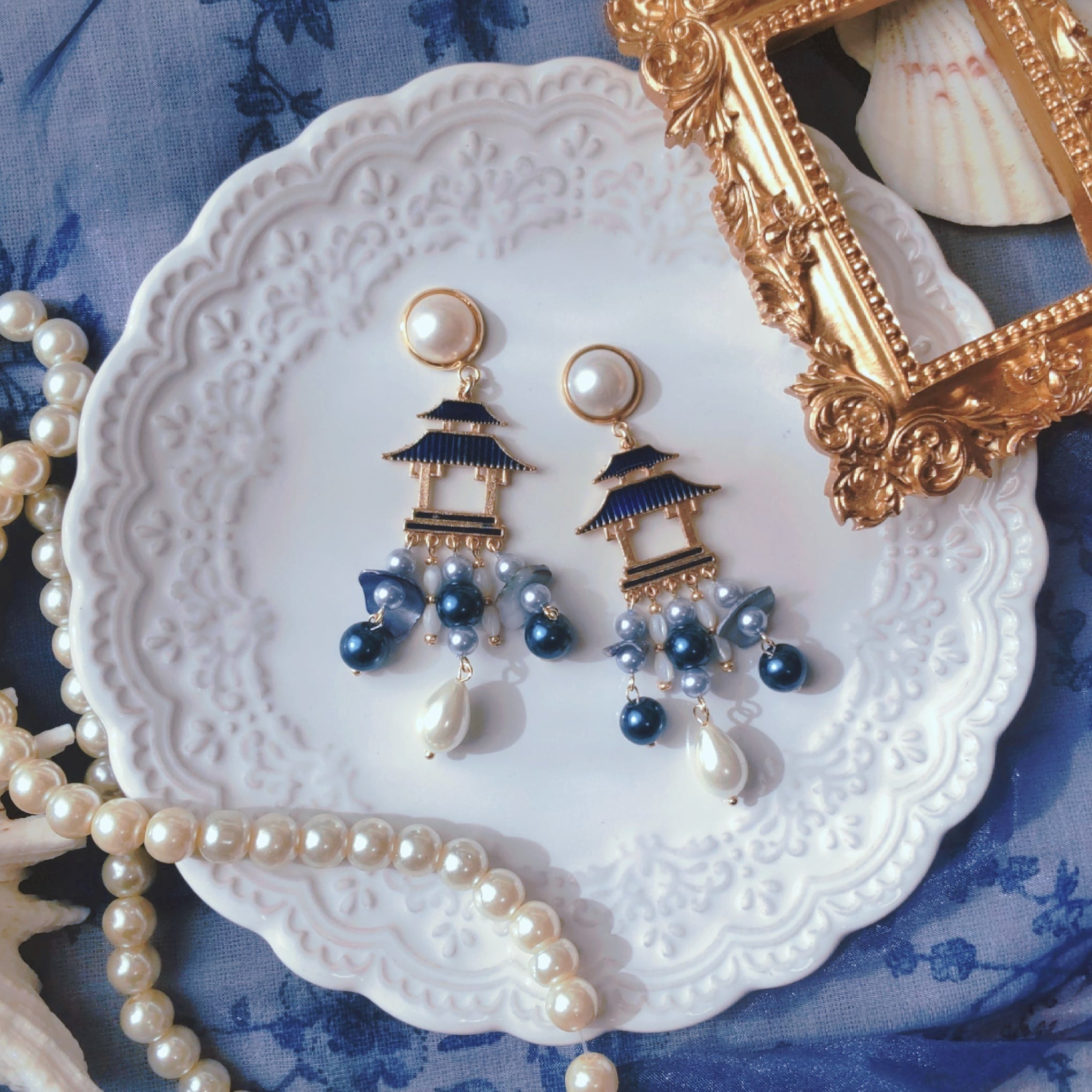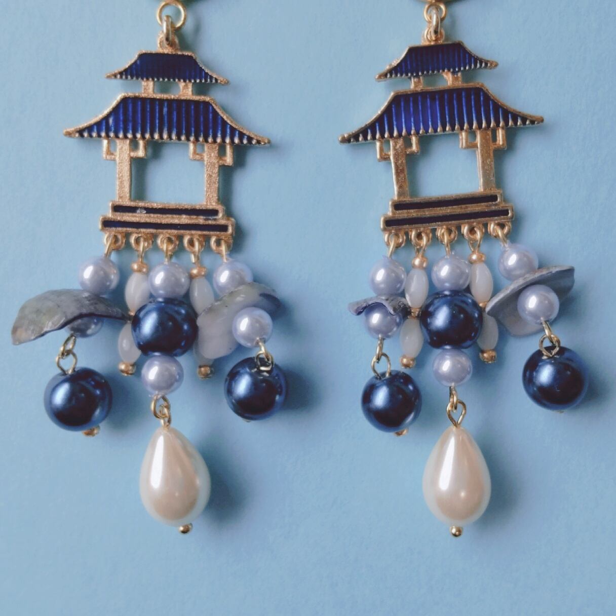 ネイビーブルーの城のパーツに同じくネイビーのパールとサックスブルーのパール、シェルが揺れます。下のドロップパールはヴィンテージです。
