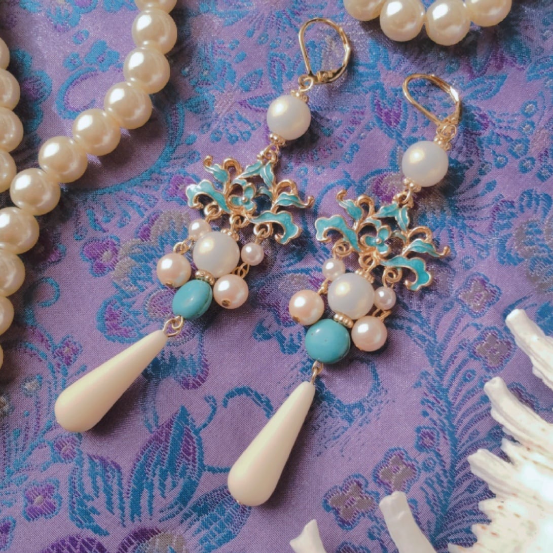 パウダリーな光沢のパール、オレンジ系の光沢のあるヴィンテージパールなど綺麗なパールが水泡のように揺れます。一番下のマットなドロップパーツもヴィンテージです。