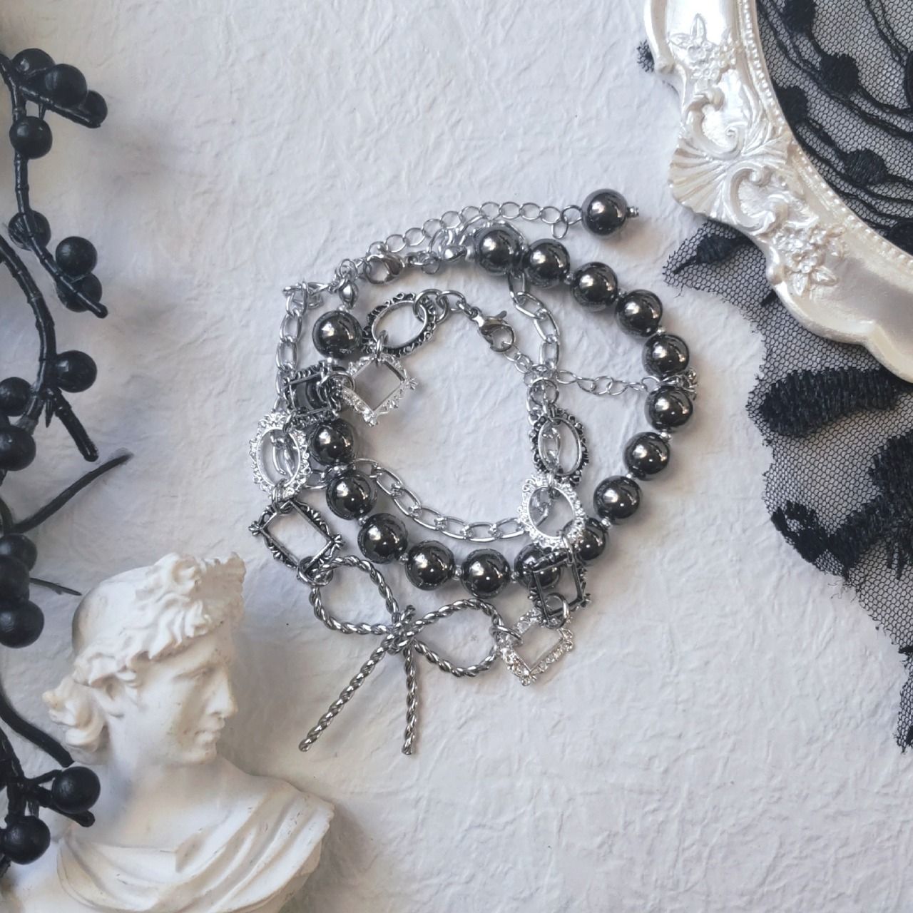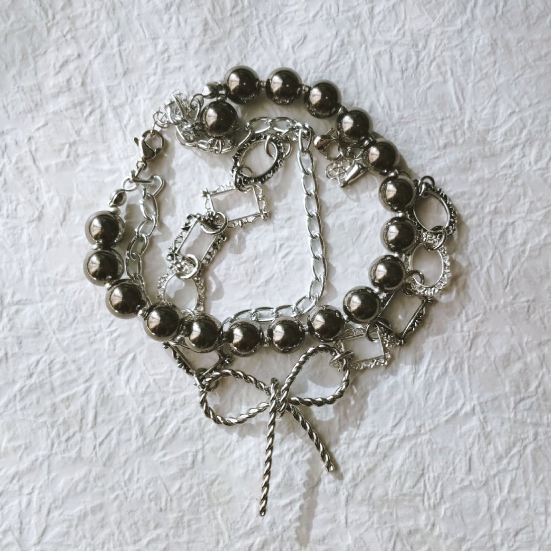 連なる様々な額縁とそれを繋ぐような立体的なリボンのブレスレットと、メタルボールとチェーンのブレスレットがセットになっています。