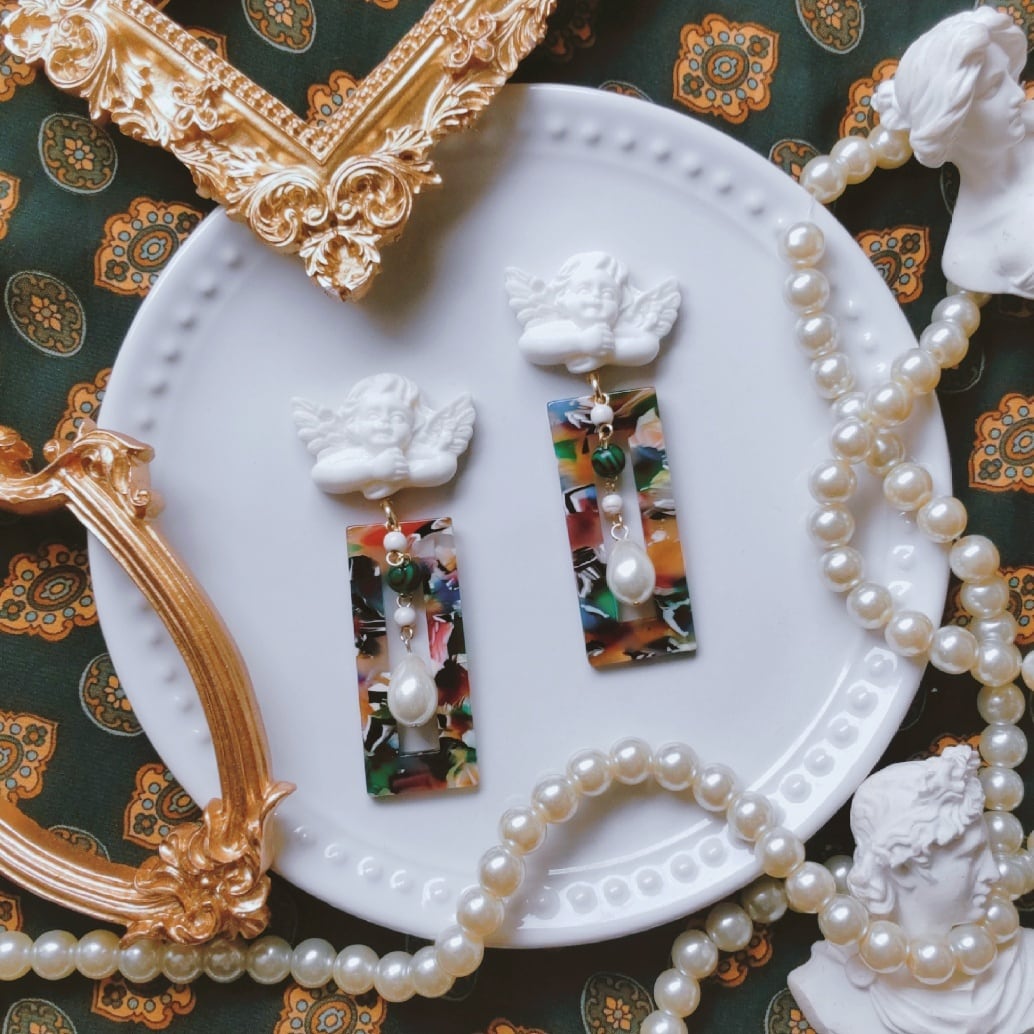 彫刻のような天使像のトップに、モダンアートのような鮮やか且つどこか大人なマルチカラーのプレートが印象的です。揺れるドロップパールはヴィンテージ、鮮やかなグリーンのビーズはマカライト。