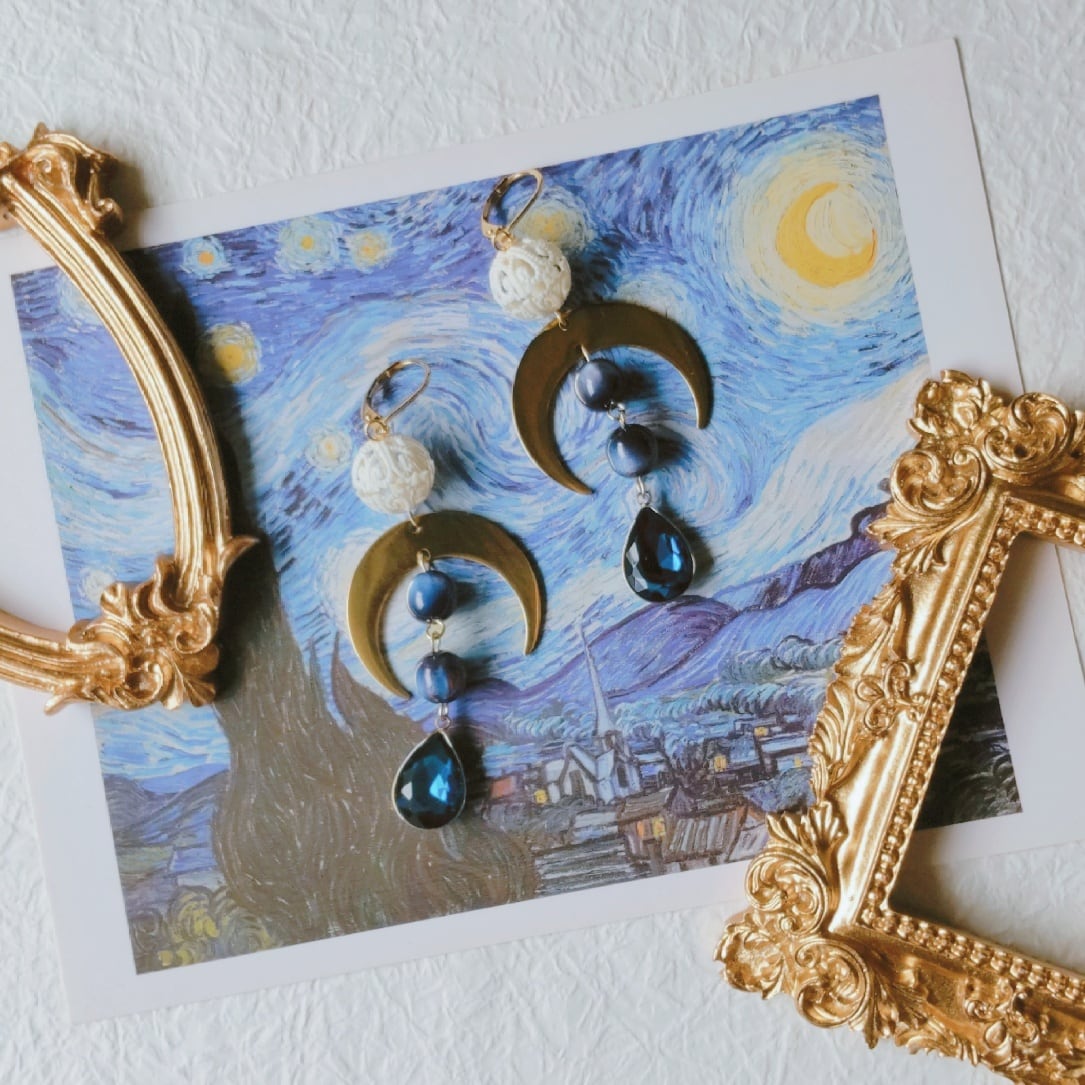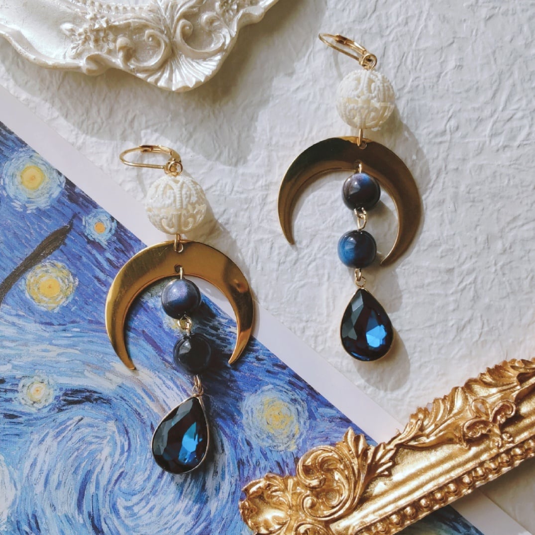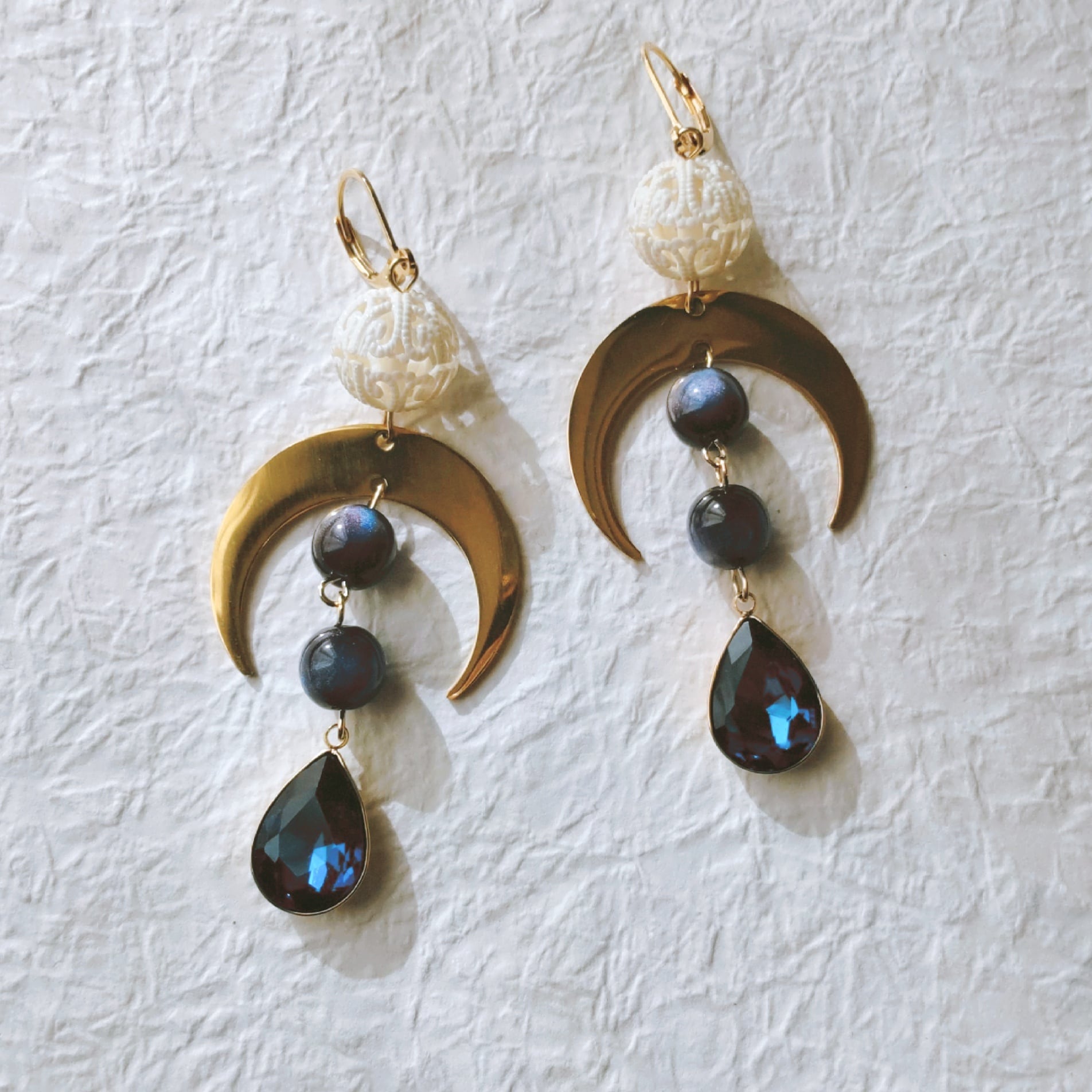 トップのレースの透かしのようなラウンドボールはヴィンテージ、そこに輝く三日月と青と赤茶のような色が油絵のように絶妙に混ざるブルー、夜色に煌めくビジューが揺れます。