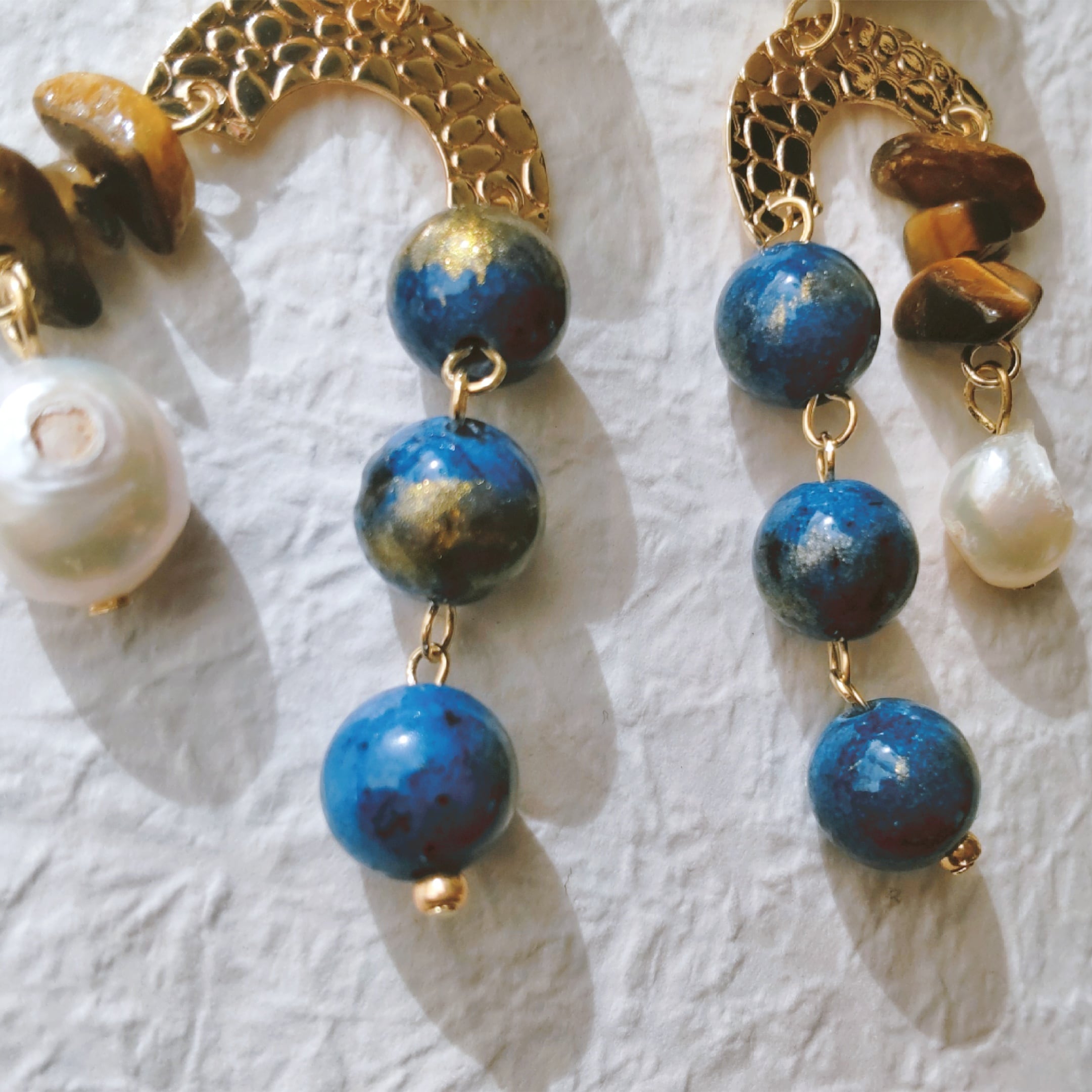 絵画の色彩を抽出したような青や黄色、茶に淡水バロックパールが印象的。