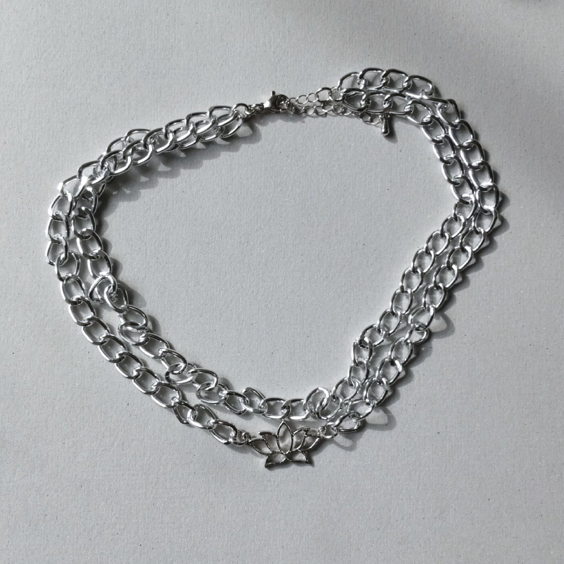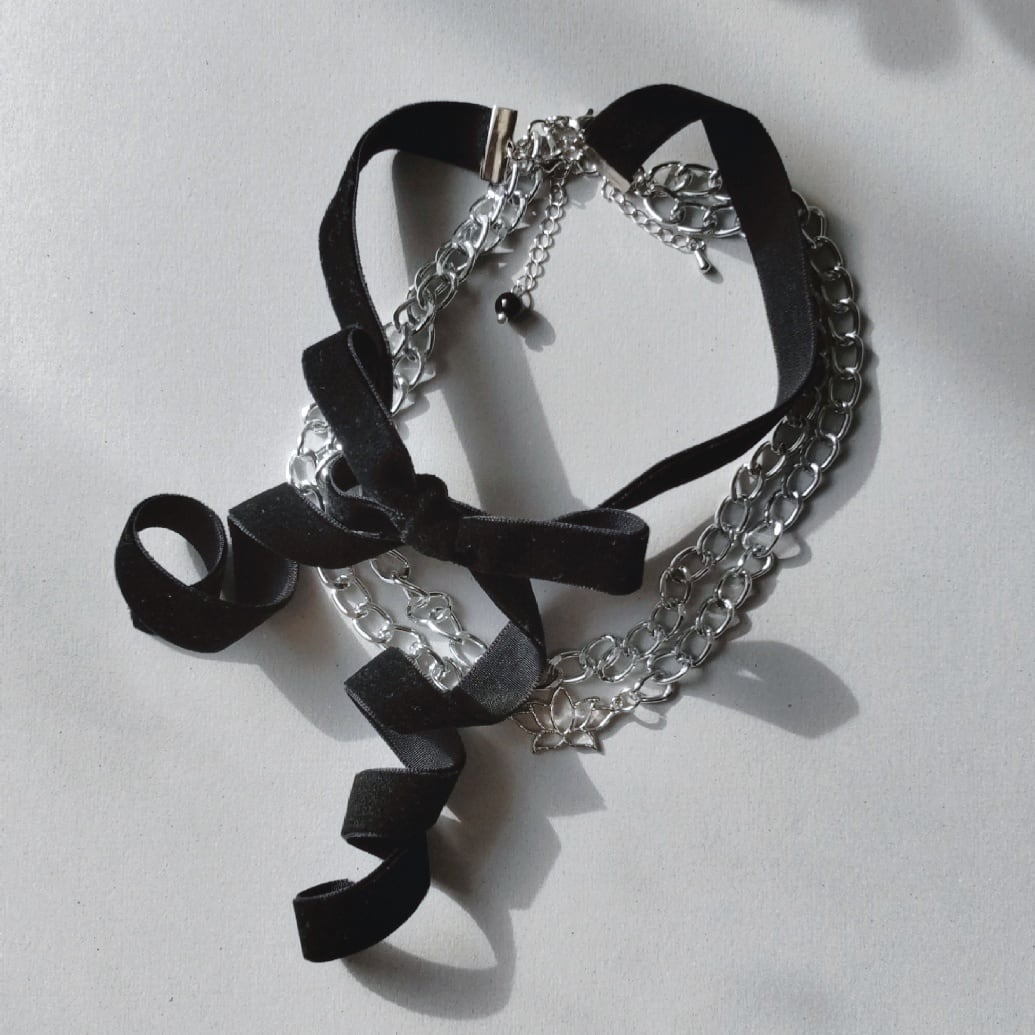くるくると垂れ下がりが可愛いリボンのついたブラックのベロアのチョーカーと、蓮のアクセントの2連チェーンネックレスがセットになっています。