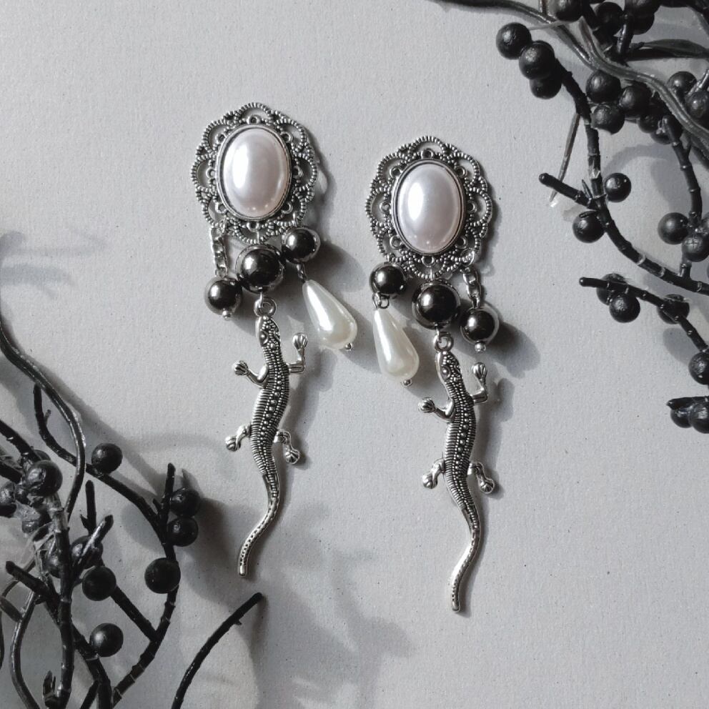 パールカボションにダークシルバーのメタルボールとパール、ミステリアスな蜥蜴が揺れます。