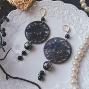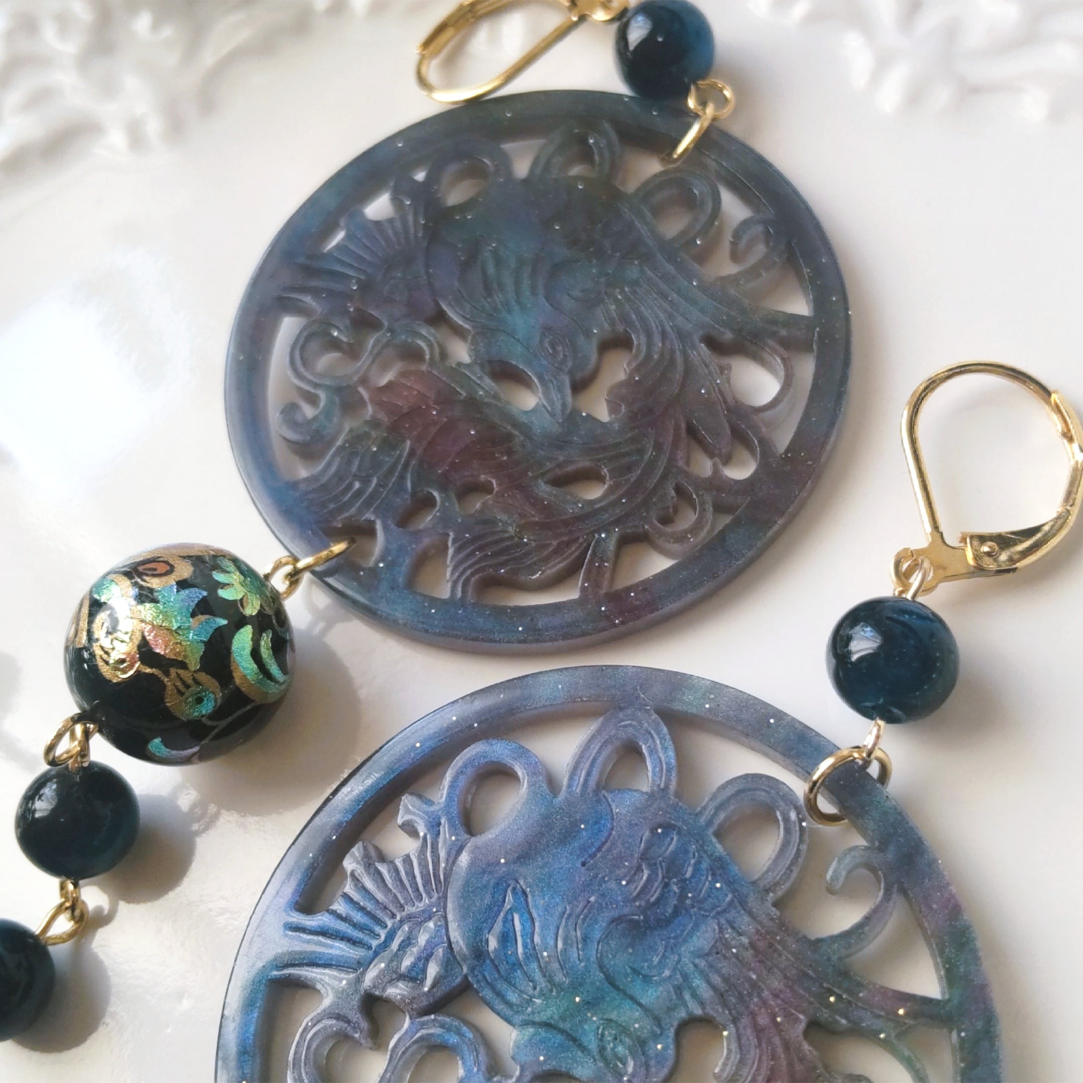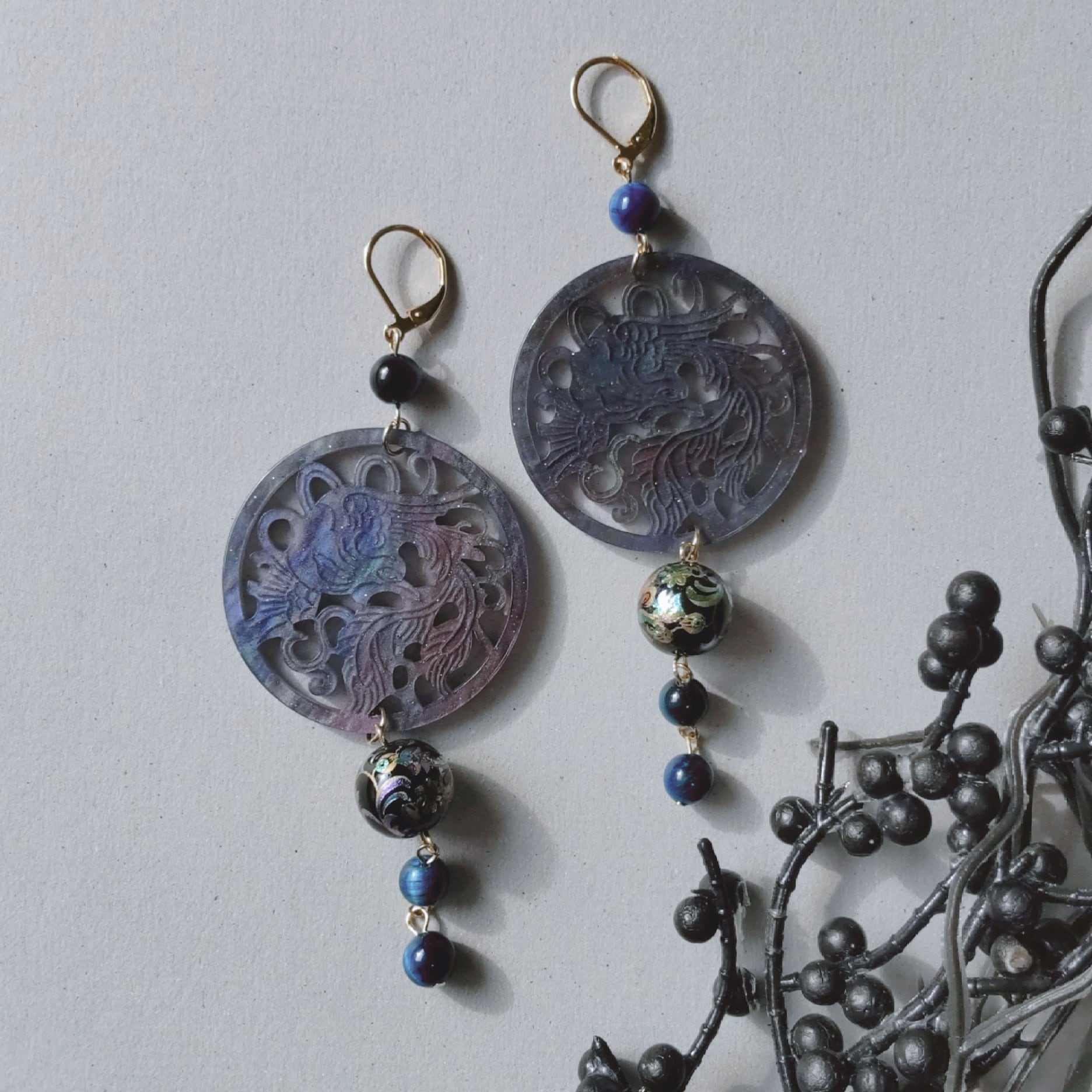 大きな円状のパーツはオリエンタルで美しい鳳凰の図柄です。闇の美しさを閉じ込めたような深いナイトブルーや霧霞んだパープルがマーブルになっています。揺れるビーズはオリエンタルな紋様ビーズとブルータイガーアイです。