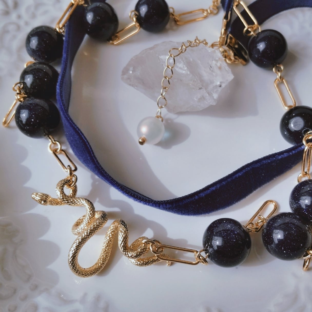 群青色のベロアチョーカーと、満天の星空のようなブルーサンドストーンに立体的な蛇がアクセントのネックレスがセットになっています。