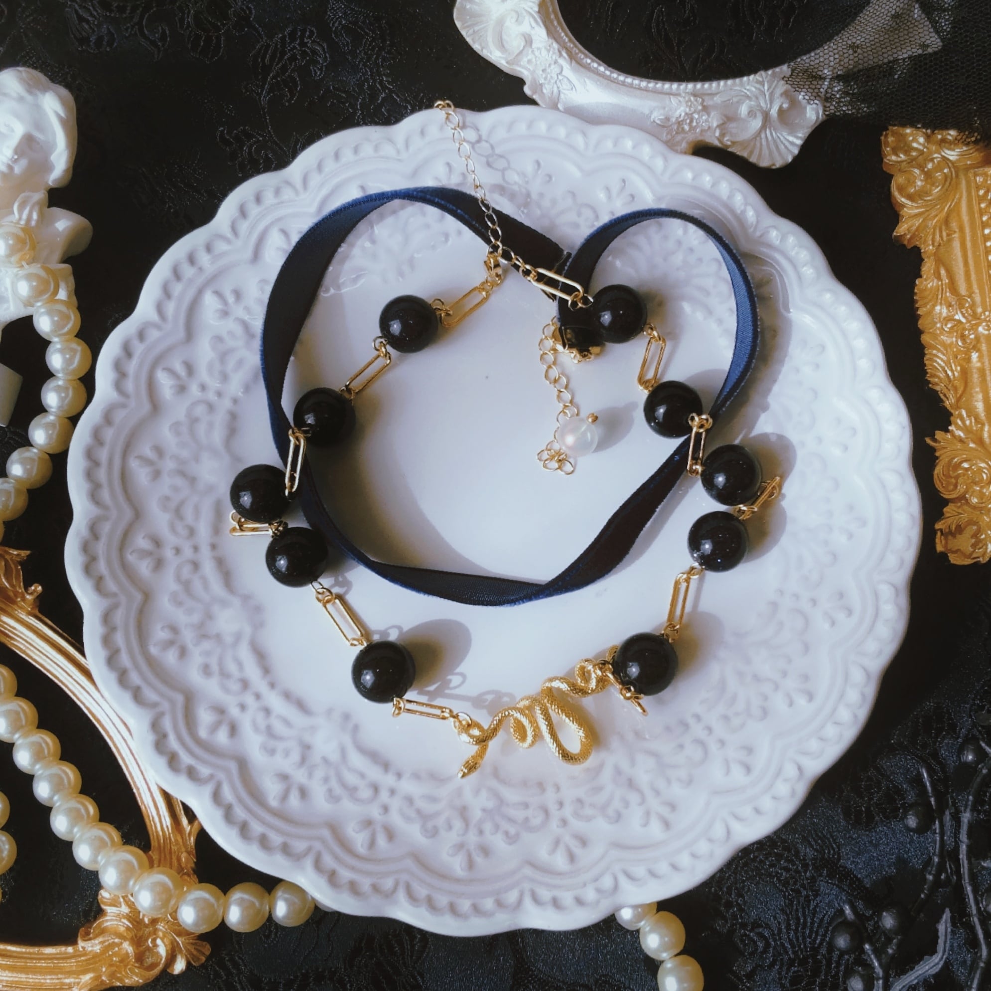 夜空の色の石と蛇とチョーカーのネックレスセット。