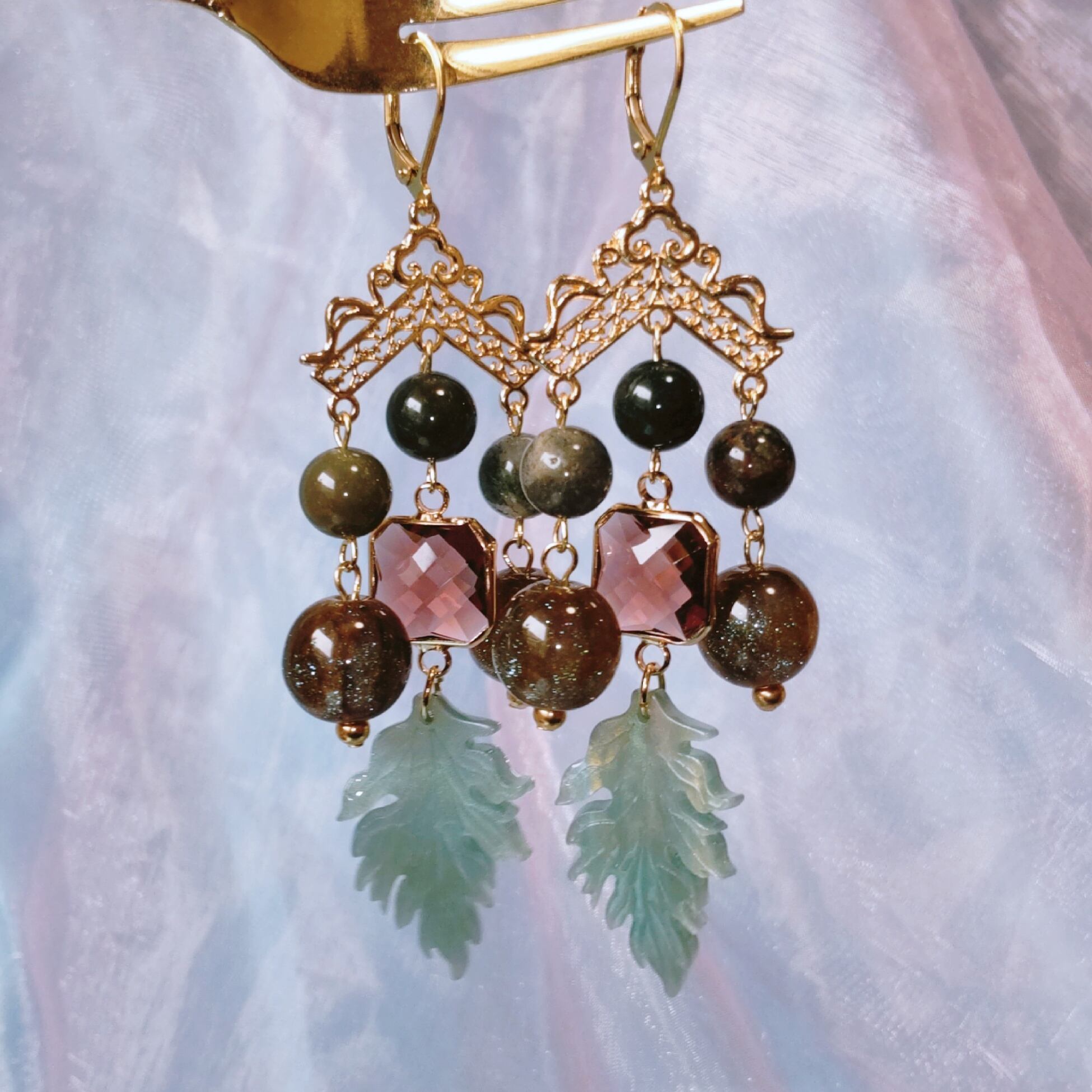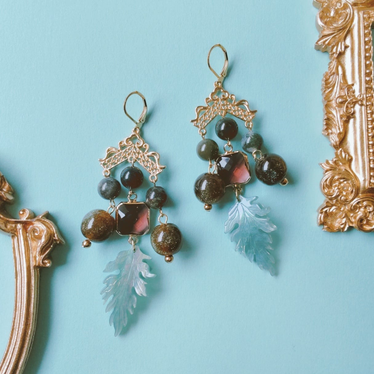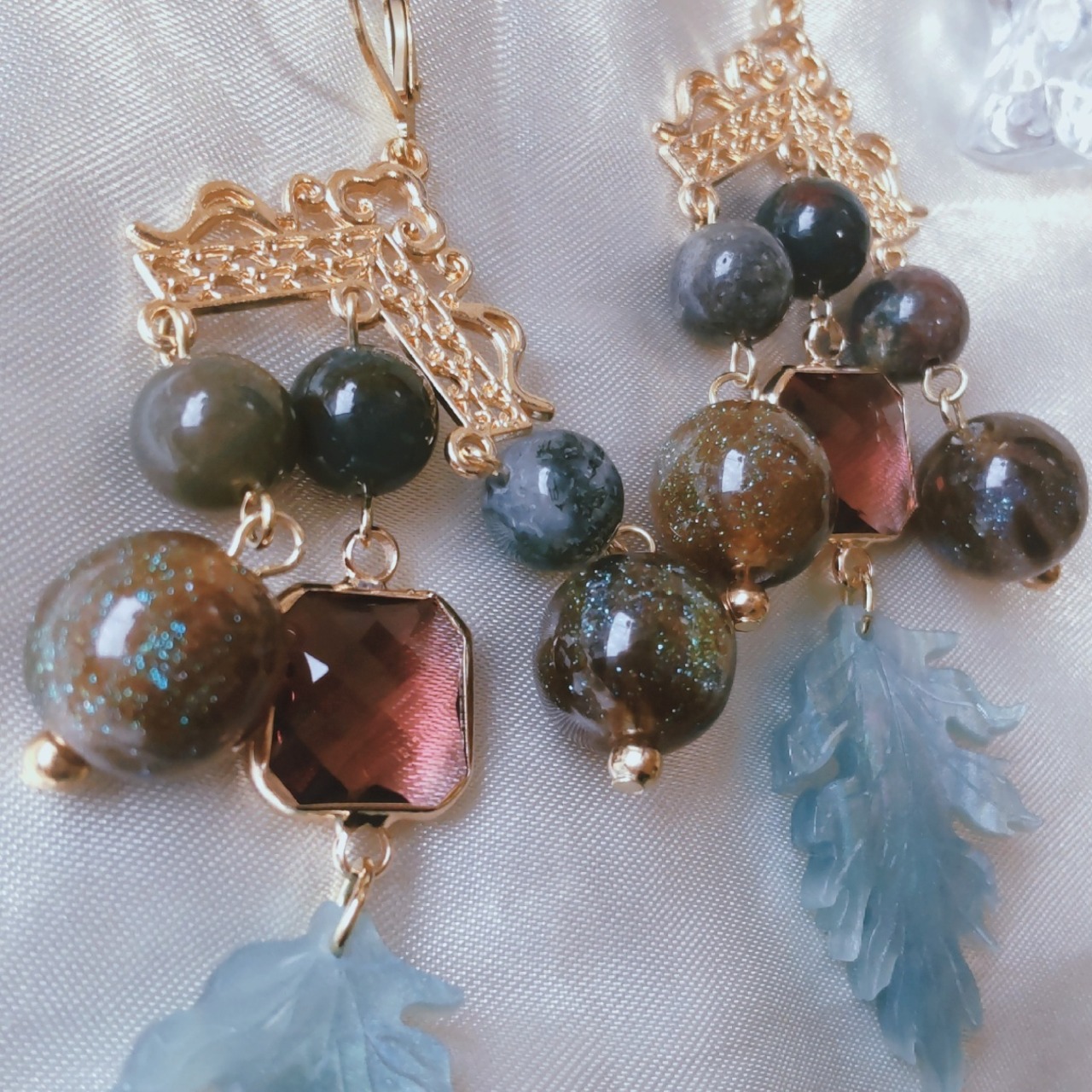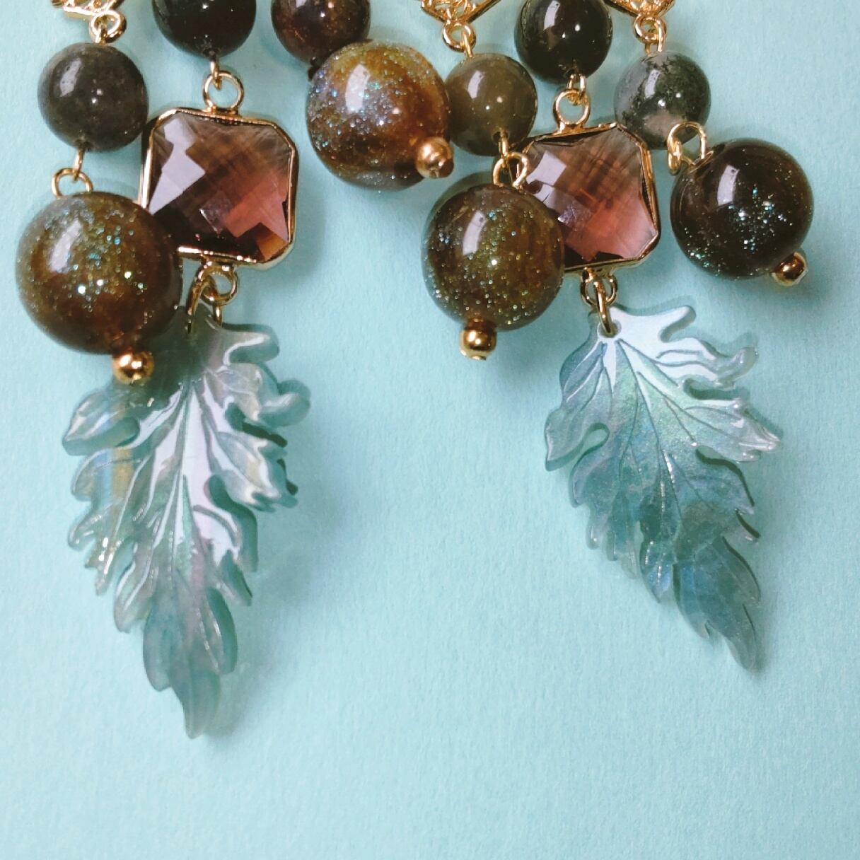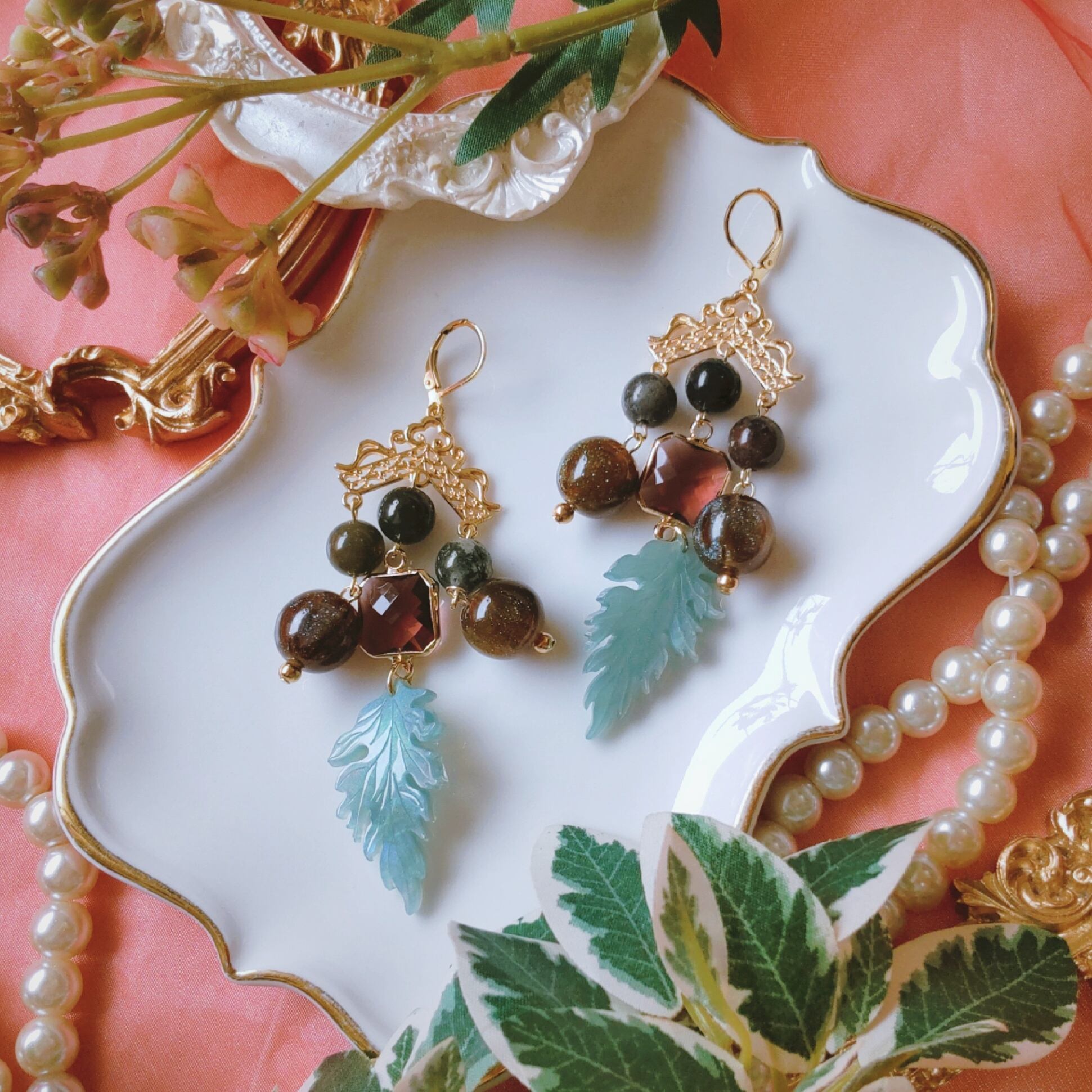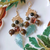 シャンデリアパーツに深みのあるインディアンアゲート、雨粒や川のせせらぎのような青の煌めきを放つブラウンビーズ、柔らかな光沢を纏った葉のパーツが優しく揺れます。