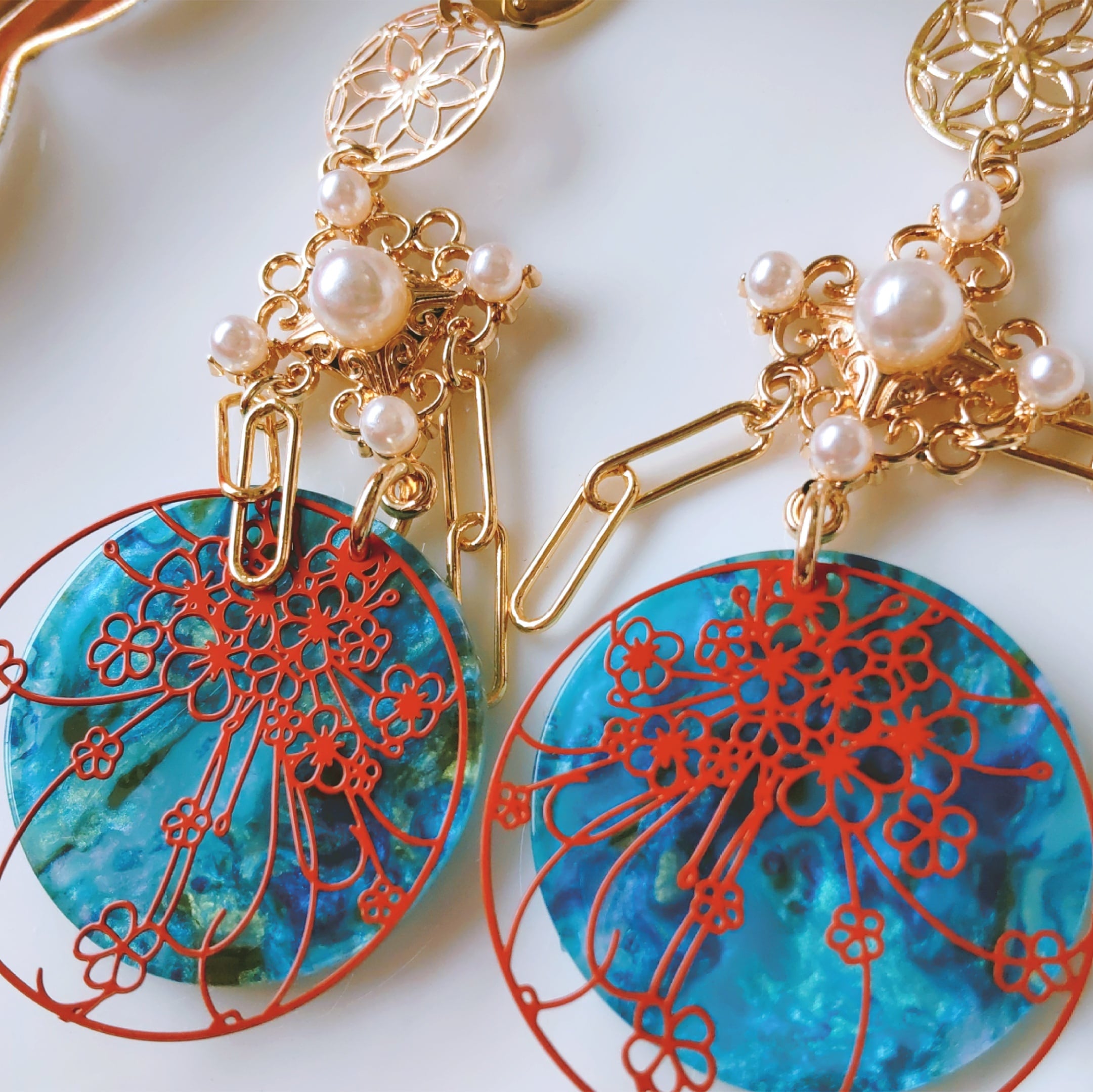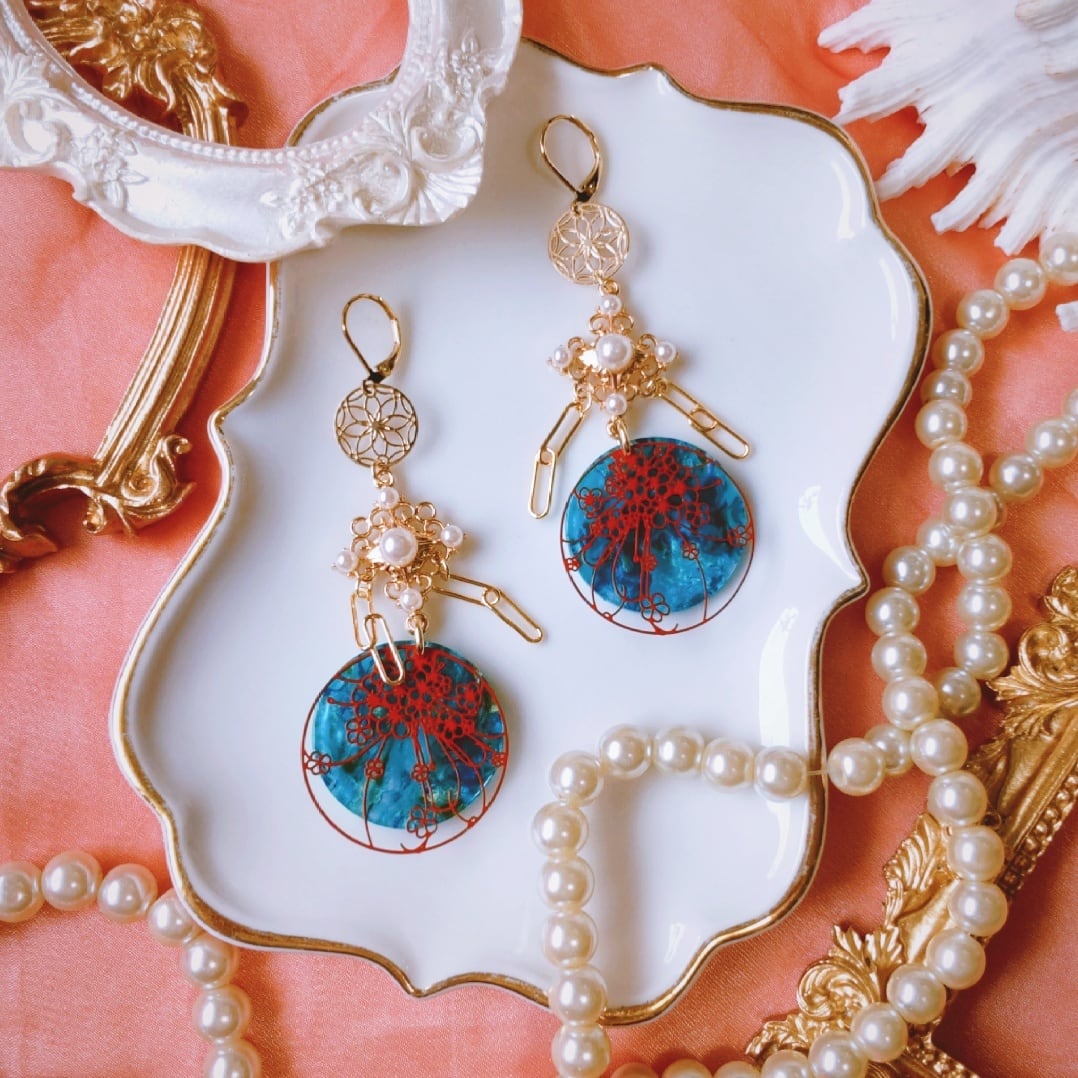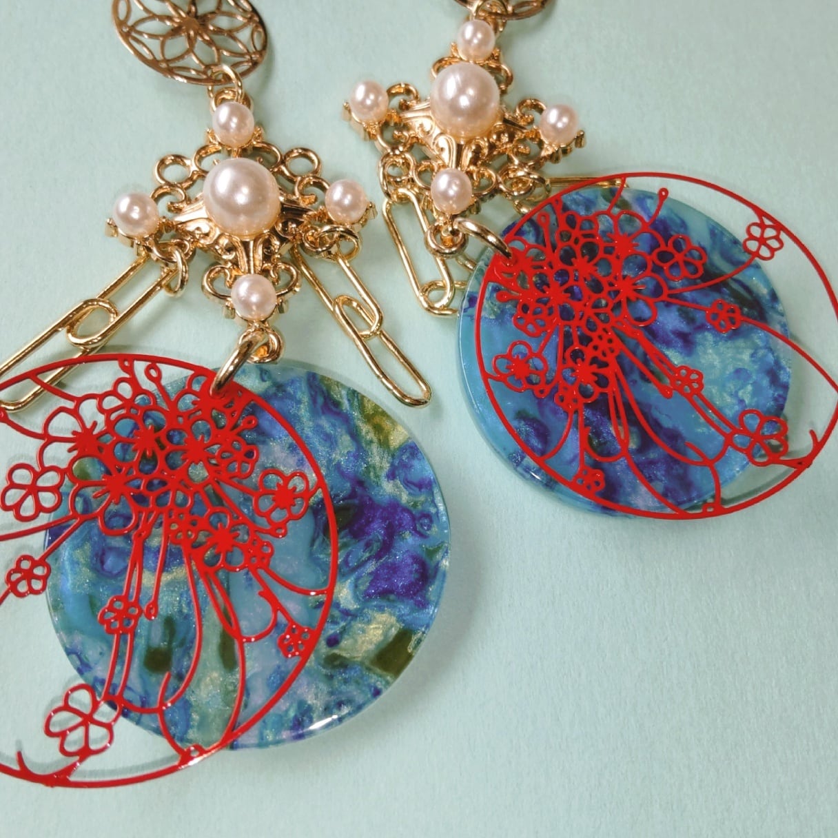 小さな透かし彫りとパールの装飾パーツに、海を閉じ込めたような色彩と輝きのプレートと真っ赤な透かしパーツが鮮やかです。