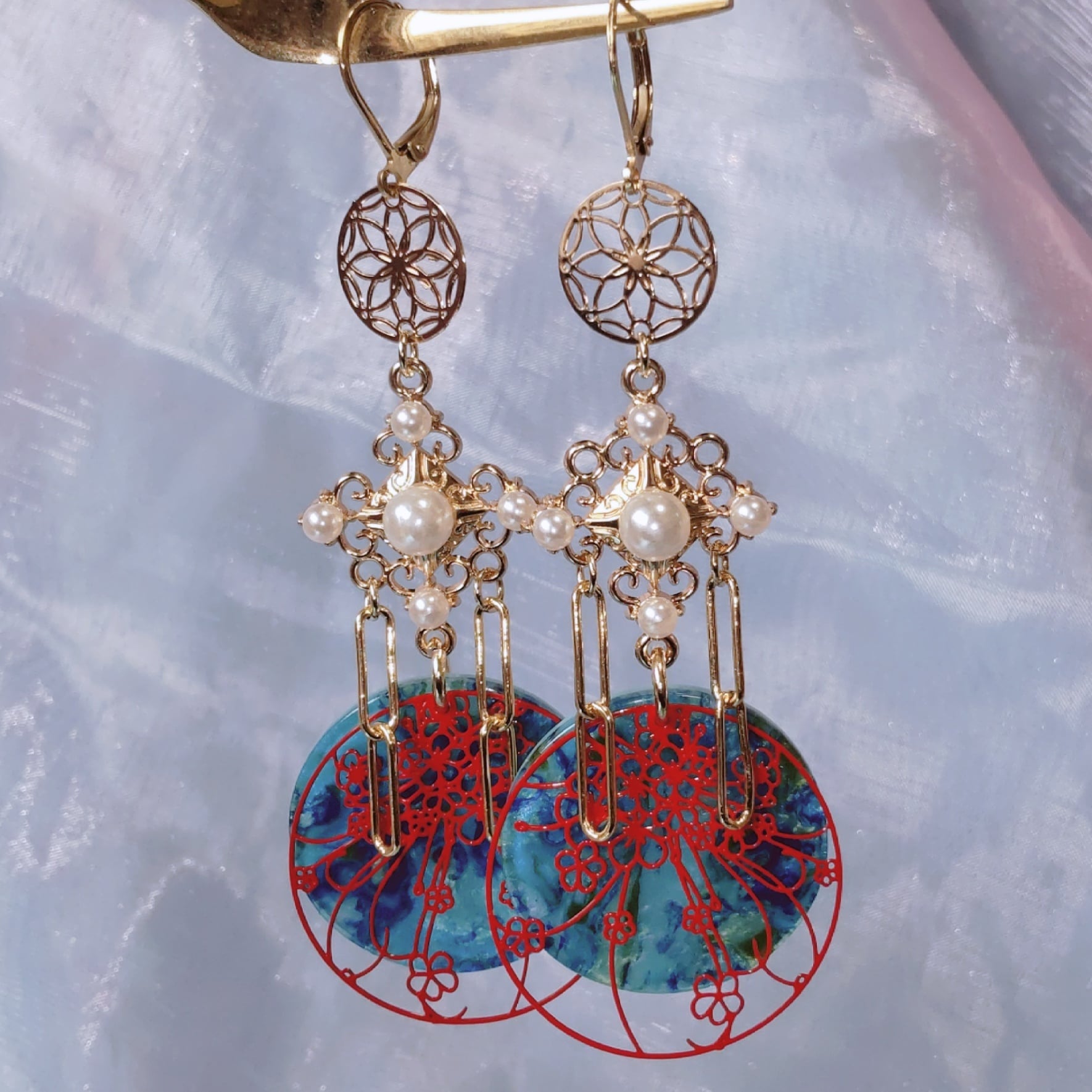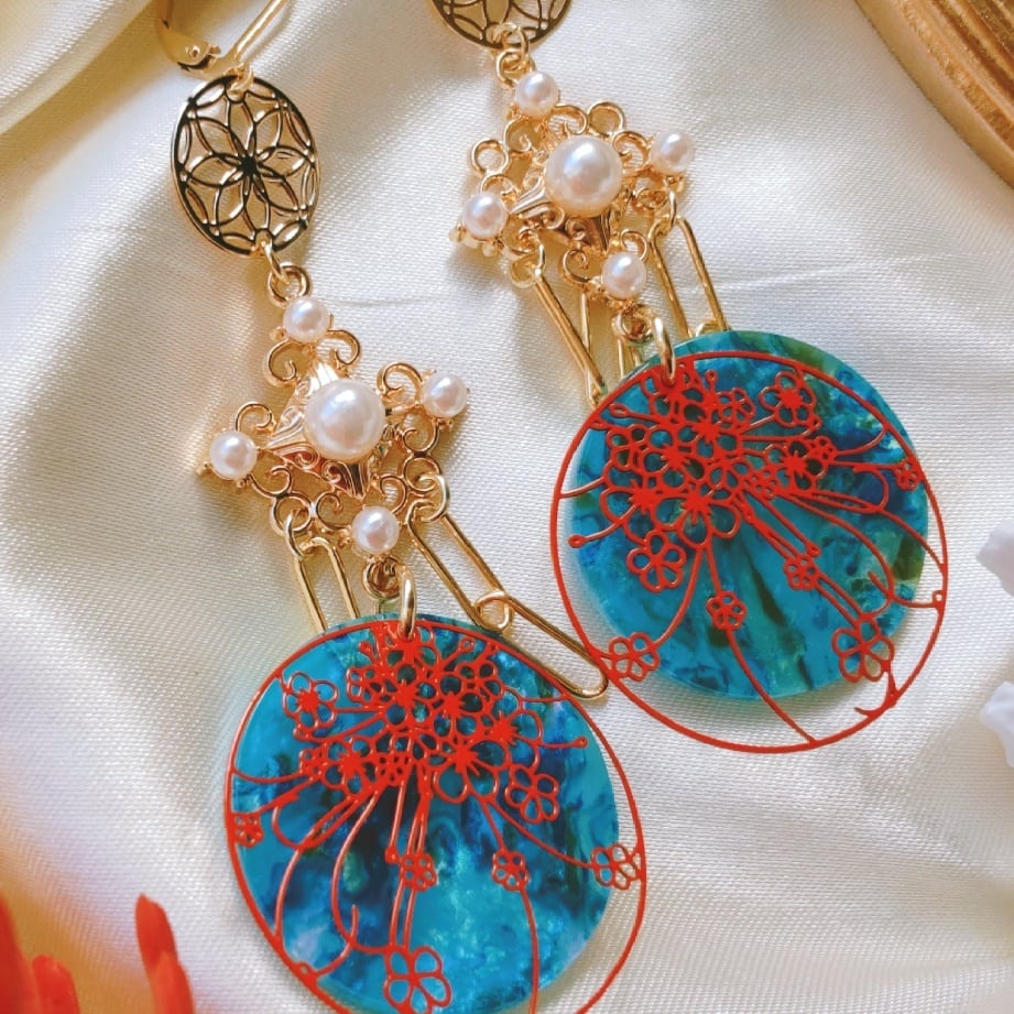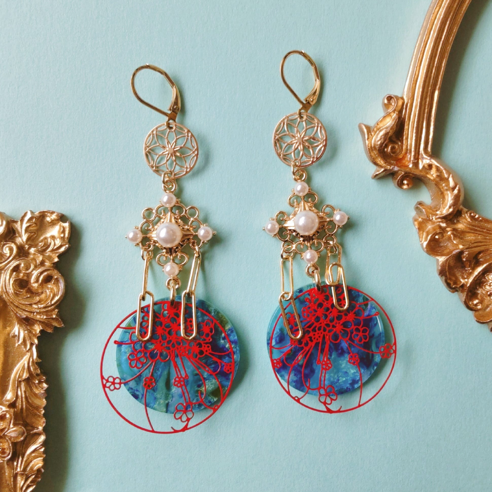 小さな透かし彫りとパールの装飾パーツに、海を閉じ込めたような色彩と輝きのプレートと真っ赤な透かしパーツが鮮やかです。