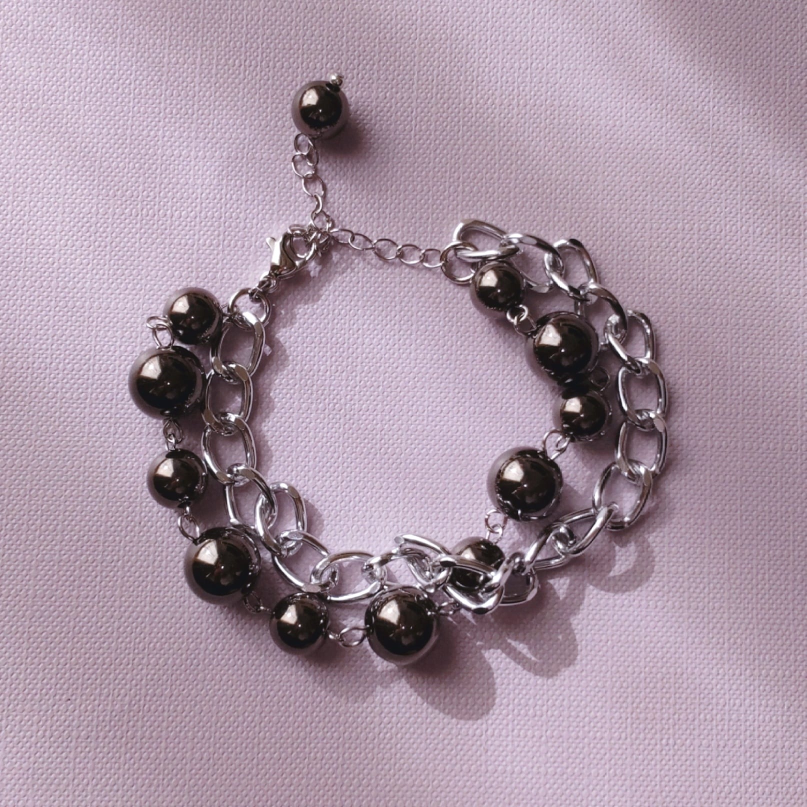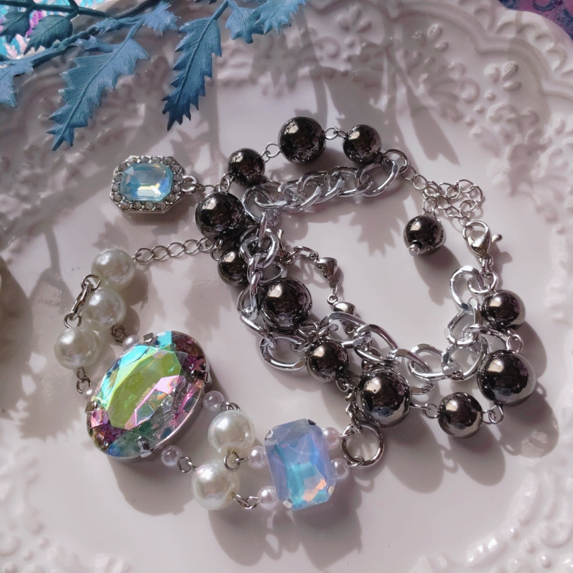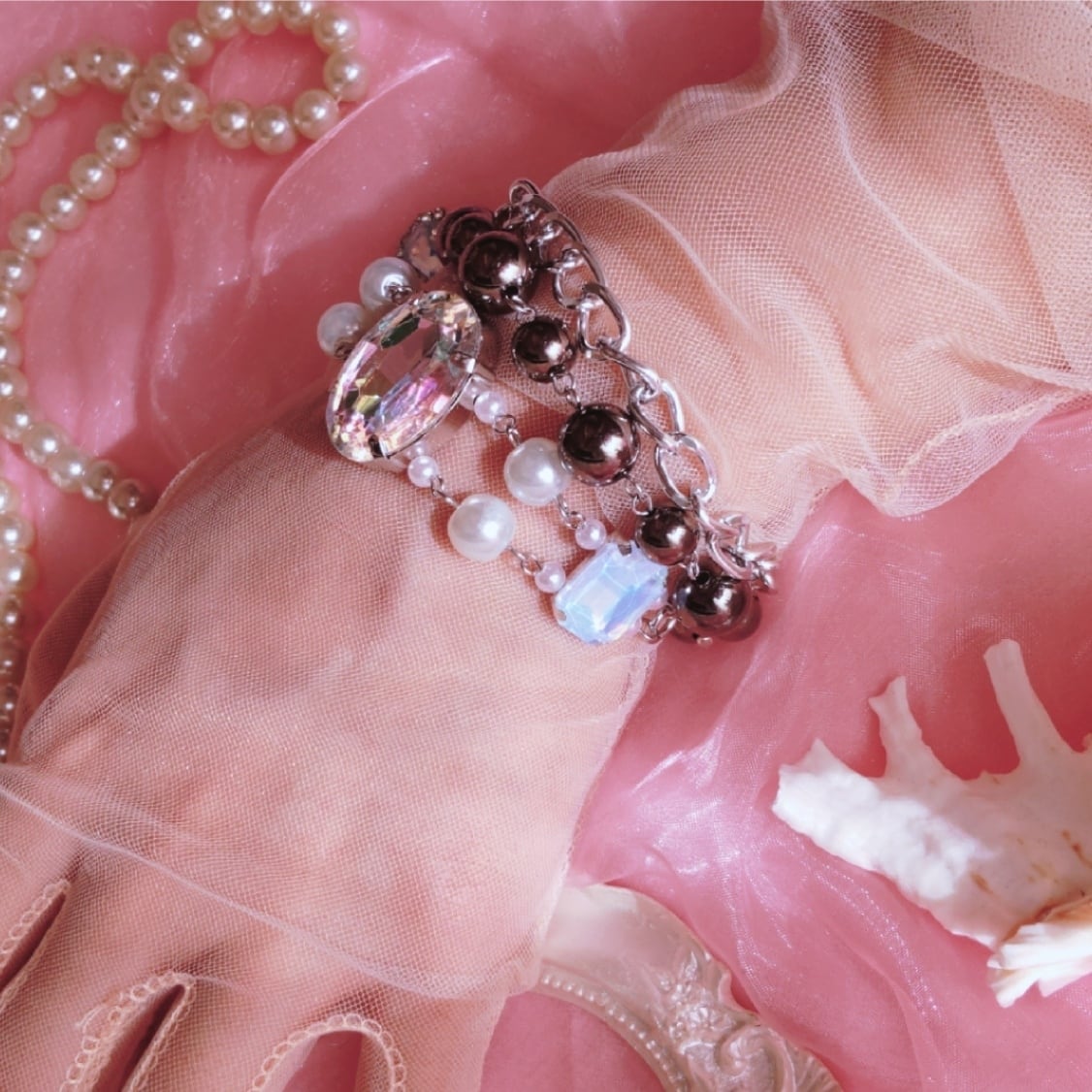 煌めく夢色の大きなビジューと甘い青のビジューにパールのブレスレットと、クールなメタルボールと大きめチェーンのブレスレットがセットになっています。