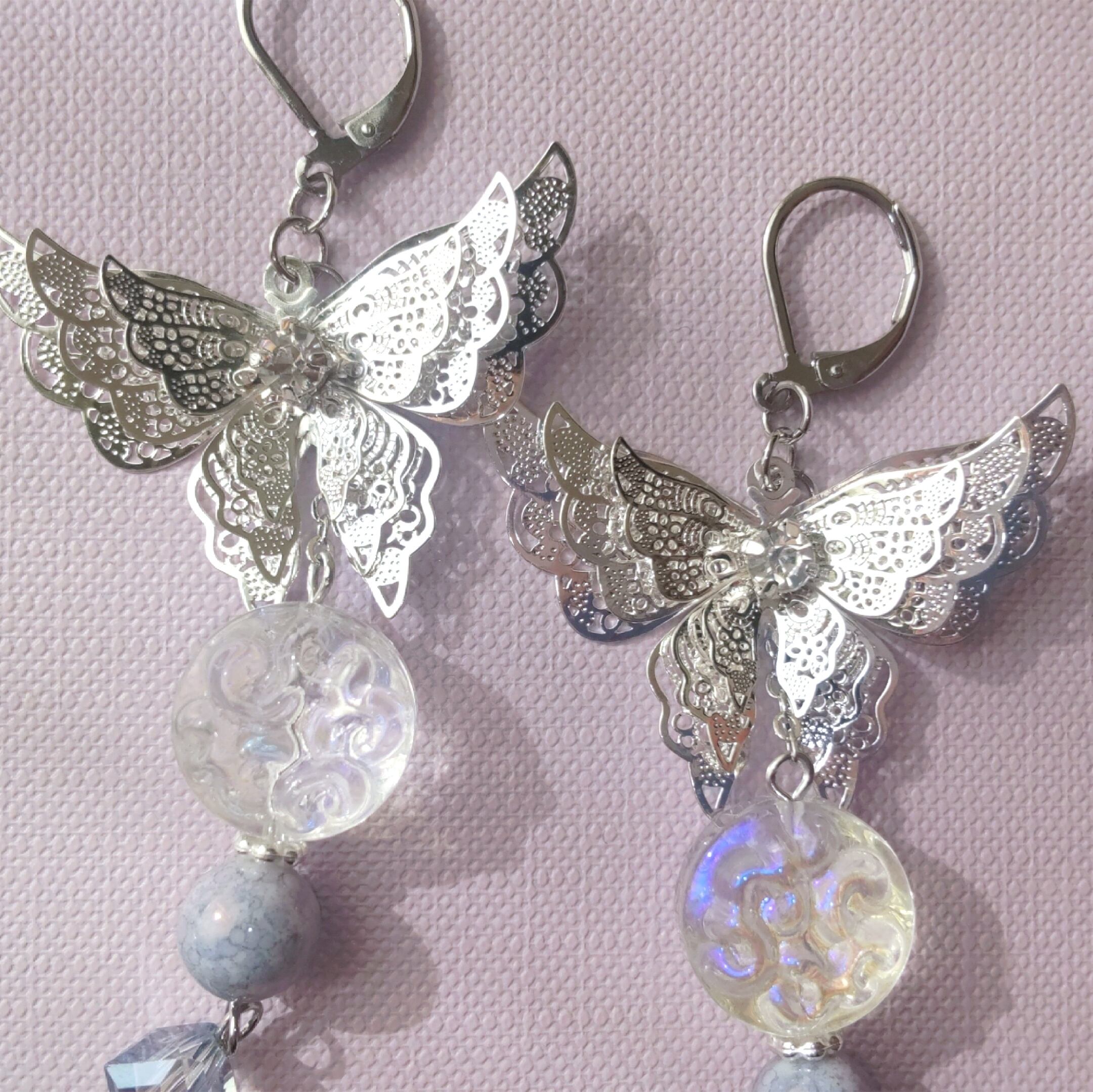 トップの蝶はセンターに小粒のビジュー、繊細な透かしの羽が多重になった美しい造りです。下には夢のような偏光のクリアビーズとブルーグレーの質感やサイズ違いのビーズが揺れます。