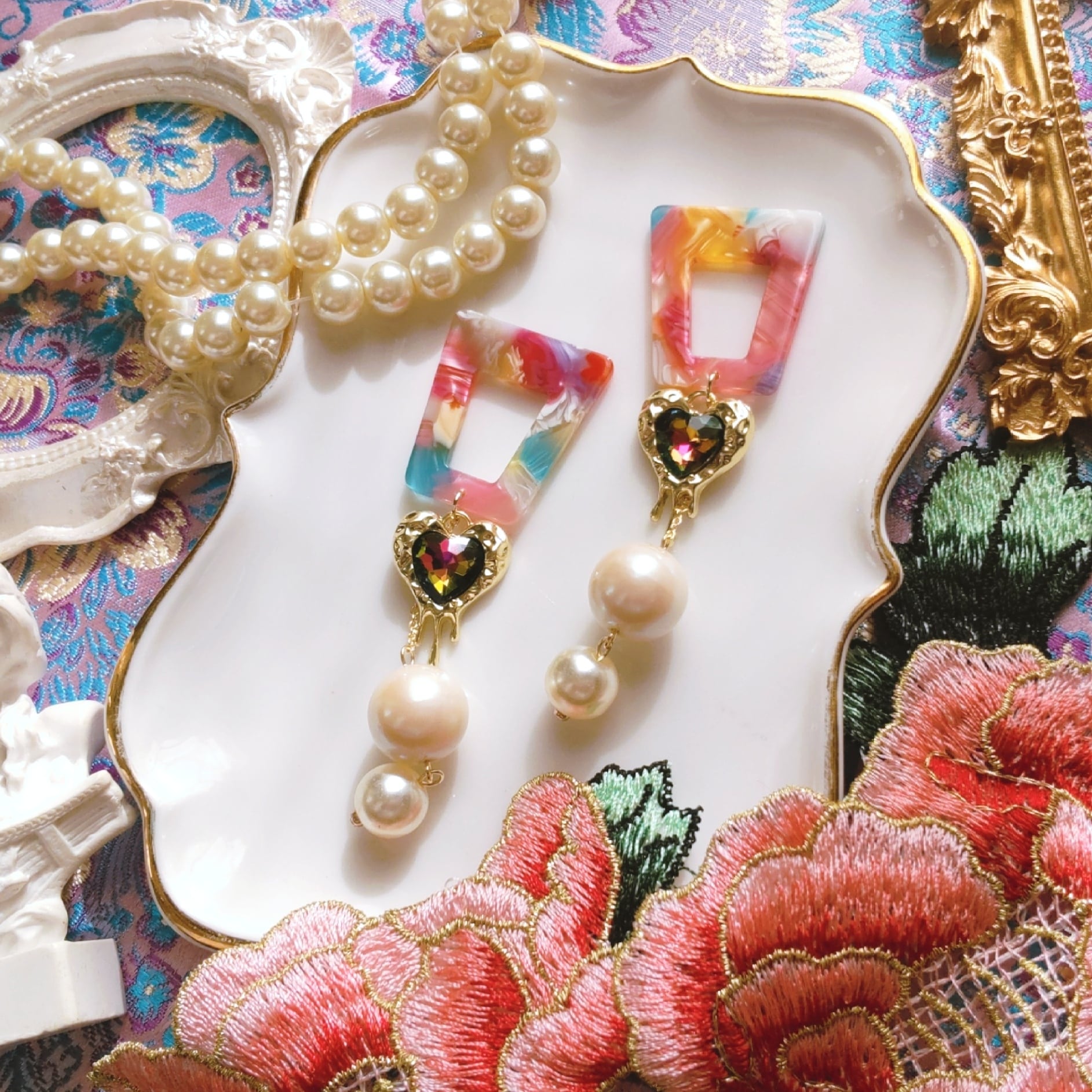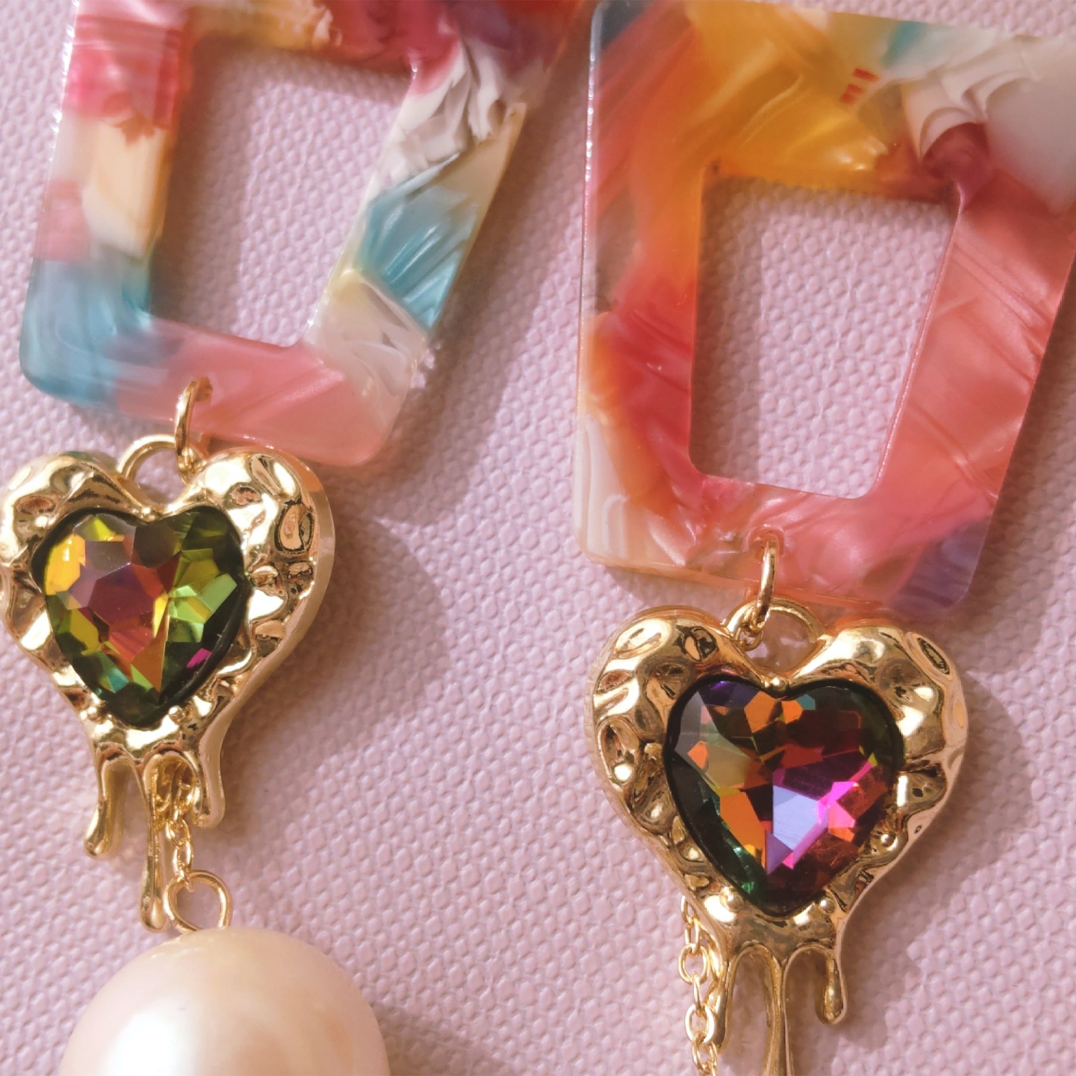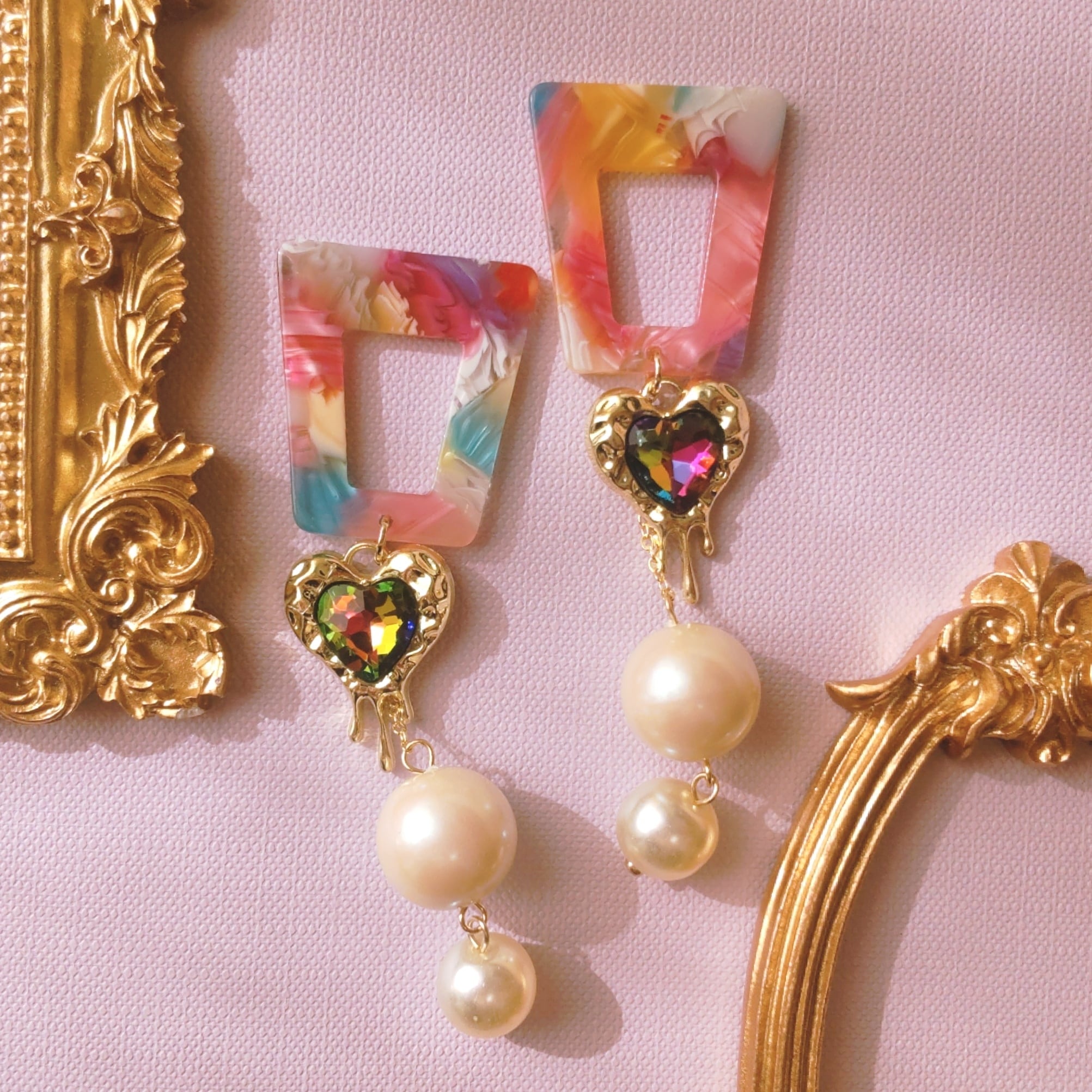 マーブルカラーとハートとパールの耳飾り。