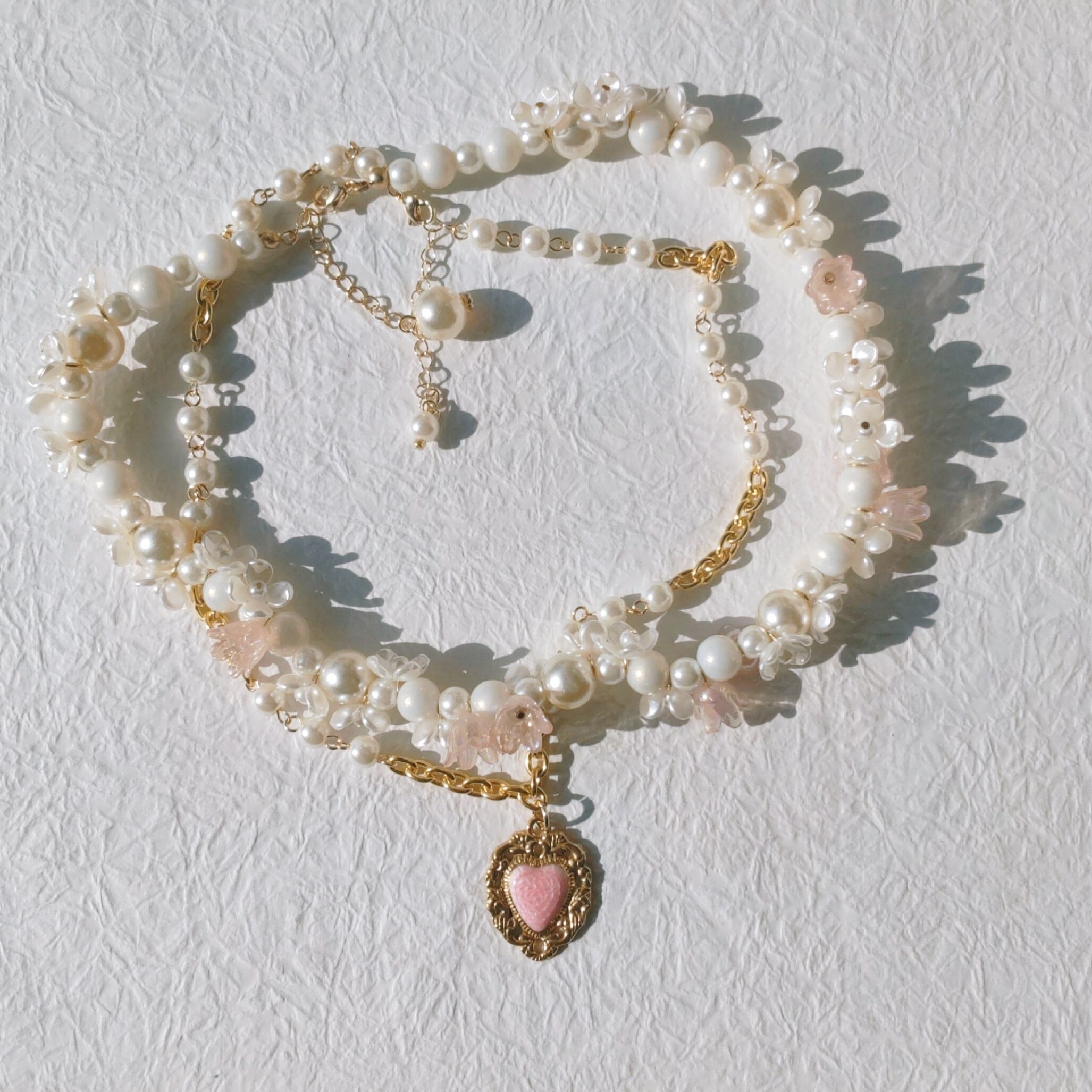 パールベースにパール質感の小花と淡いピンクベージュにオーロラ偏光の小花が咲いたネックレスと、チェーンとパールにつやめくピンクが綺麗なハートのチャームネックレスがセットになっています。