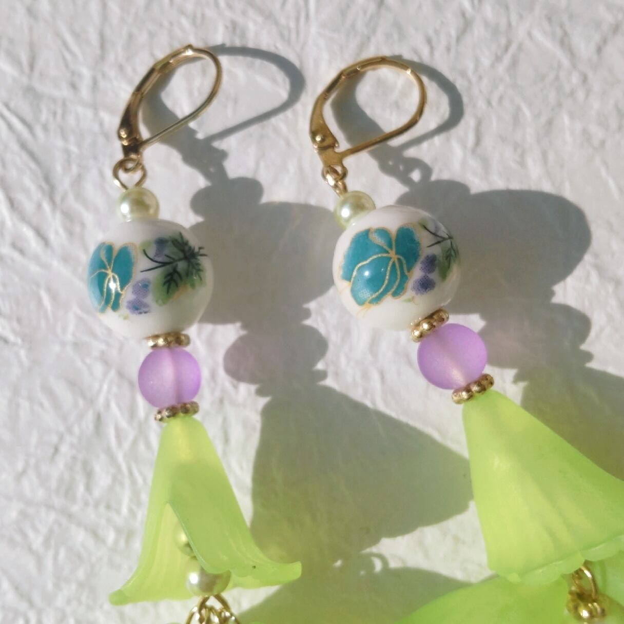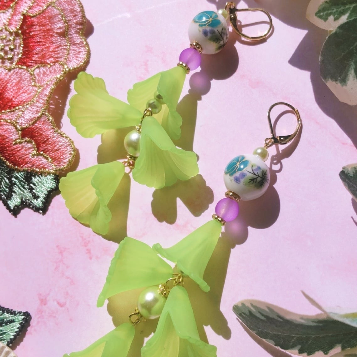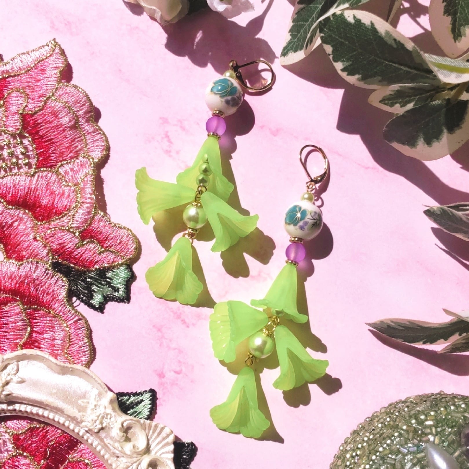 オリエンタルな陶器ビーズに柔らかい透け感のあるパープル、そして新芽のようなライムグリーンの花が軽やかで華やか。