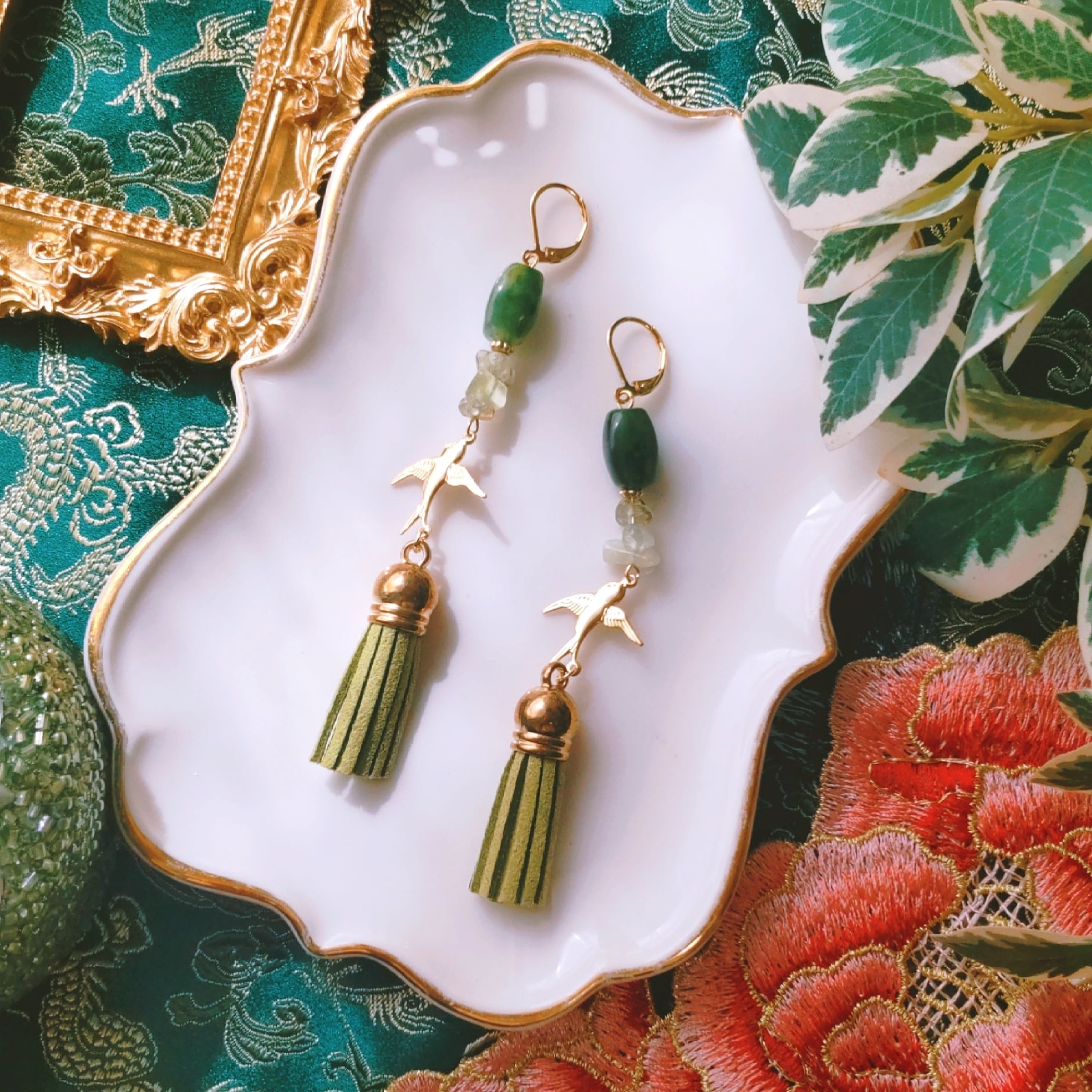 マーブル感のあるグリーンのトップパーツにアベンチュリンの細石、飛び立つ小鳥と小ぶりのタッセルが揺れます。