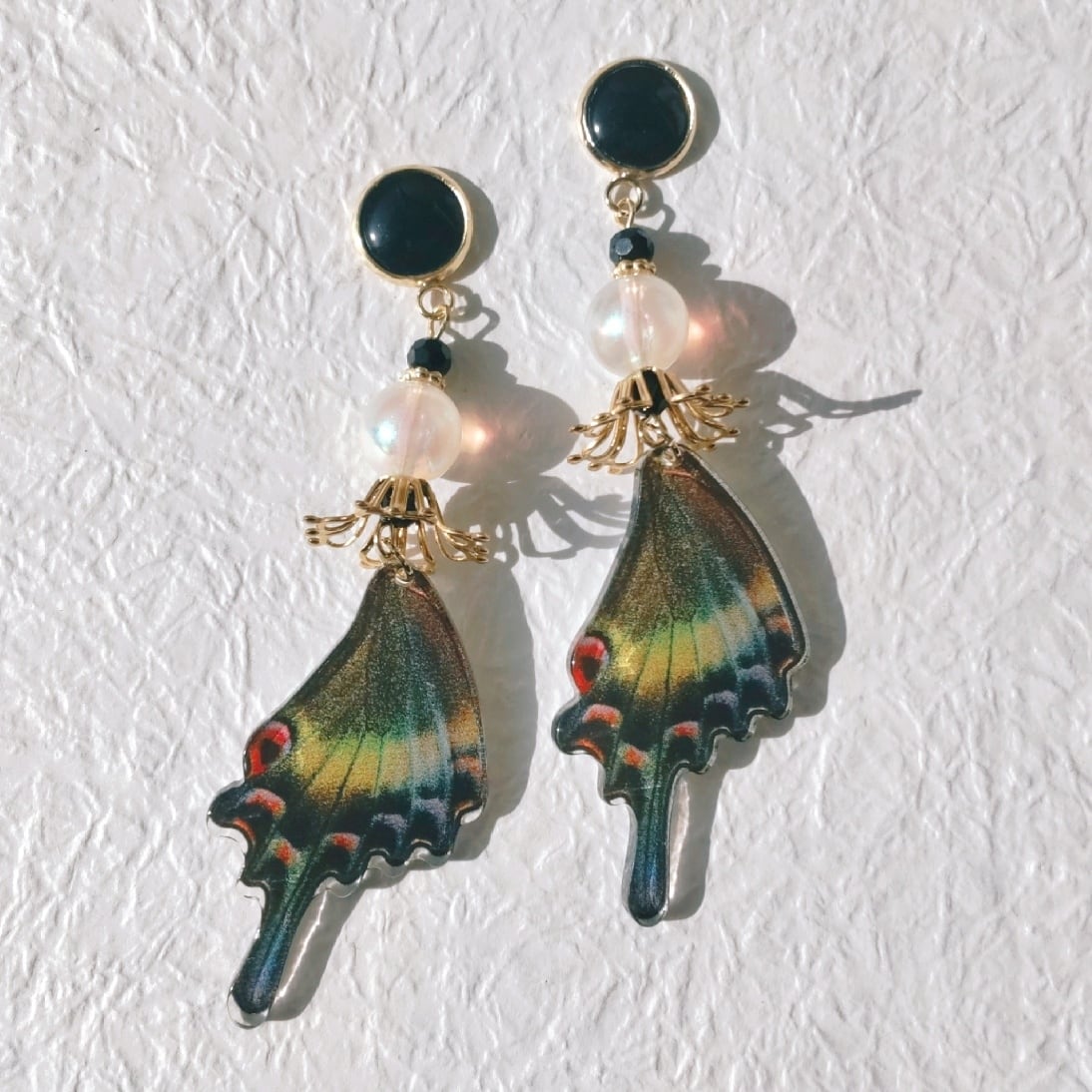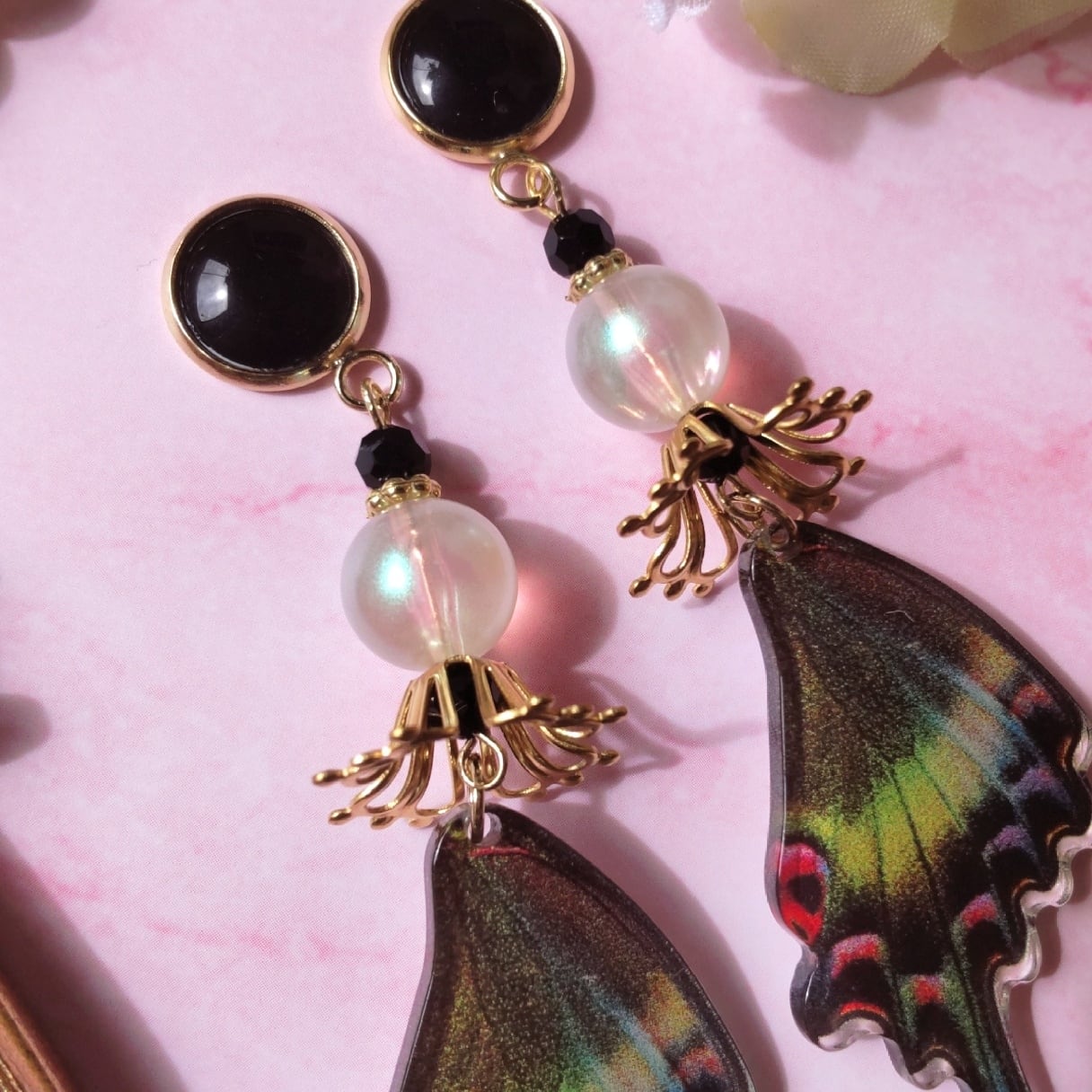 ブラックのトップパーツ、夢色のシャボンのようなビーズに蝶の羽が綺麗です。羽は黒とも緑ともとれないような繊細な色彩で魅入ってしまいそう。