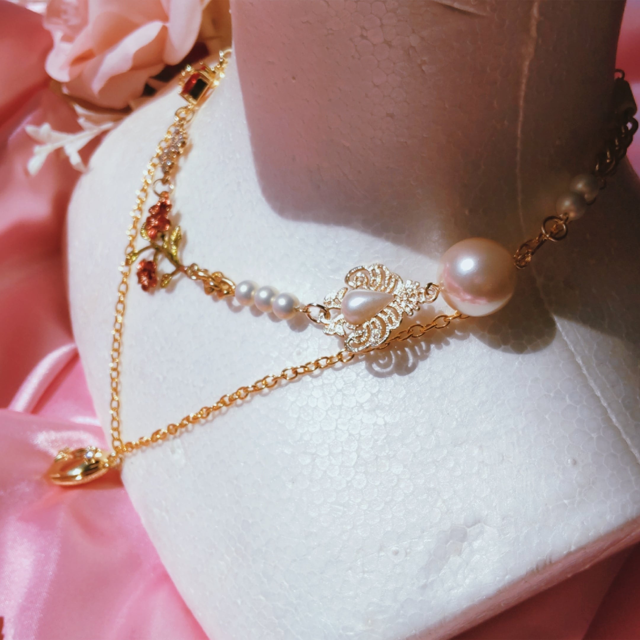 ビジューが小さく輝くロケットペンダントのネックレスと、バラやコラソンにクロス、ヴィンテージパールやパウダリーパールなどが連なった華やかなネックレスがセットになっています。