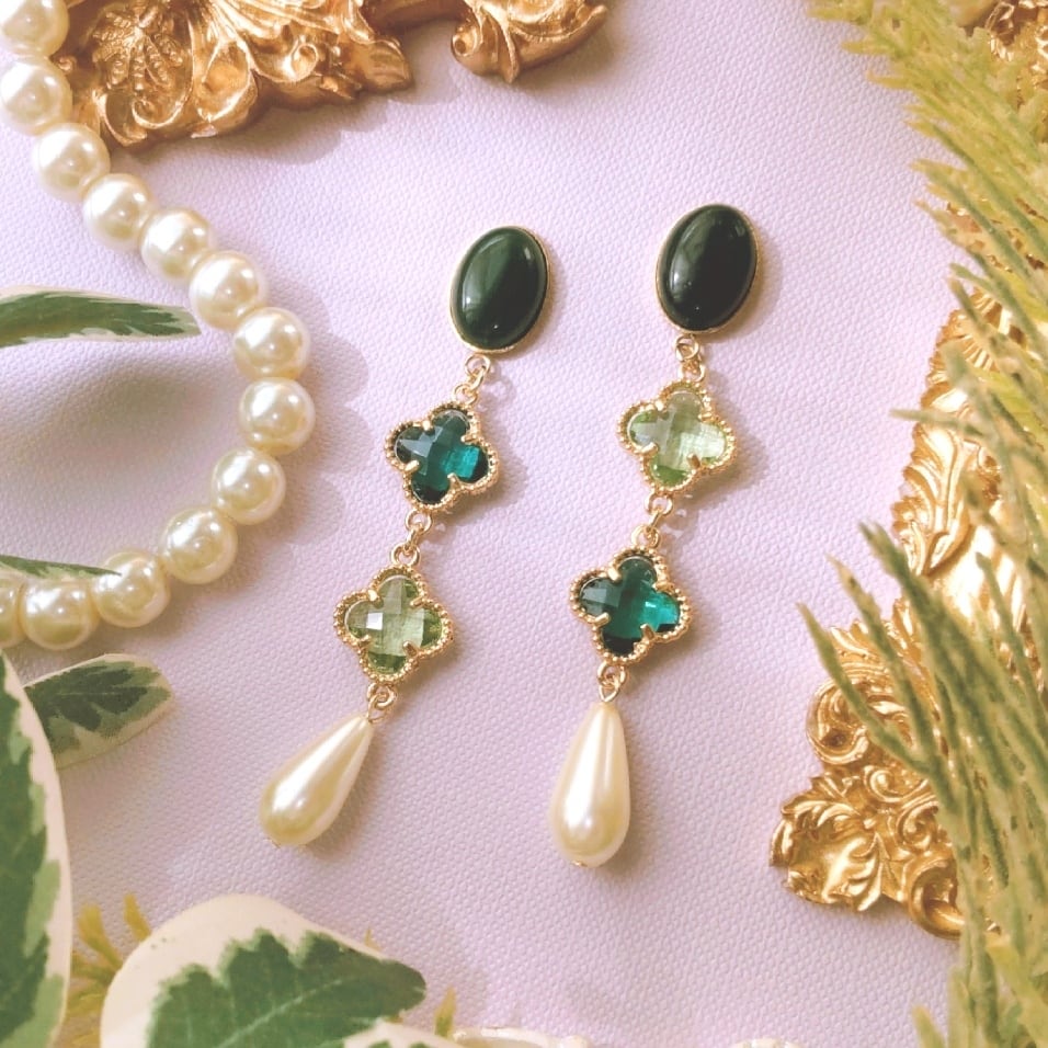 四葉のクローバー型のビジューは濃淡2色。下のドロップパールはヴィンテージパールです。